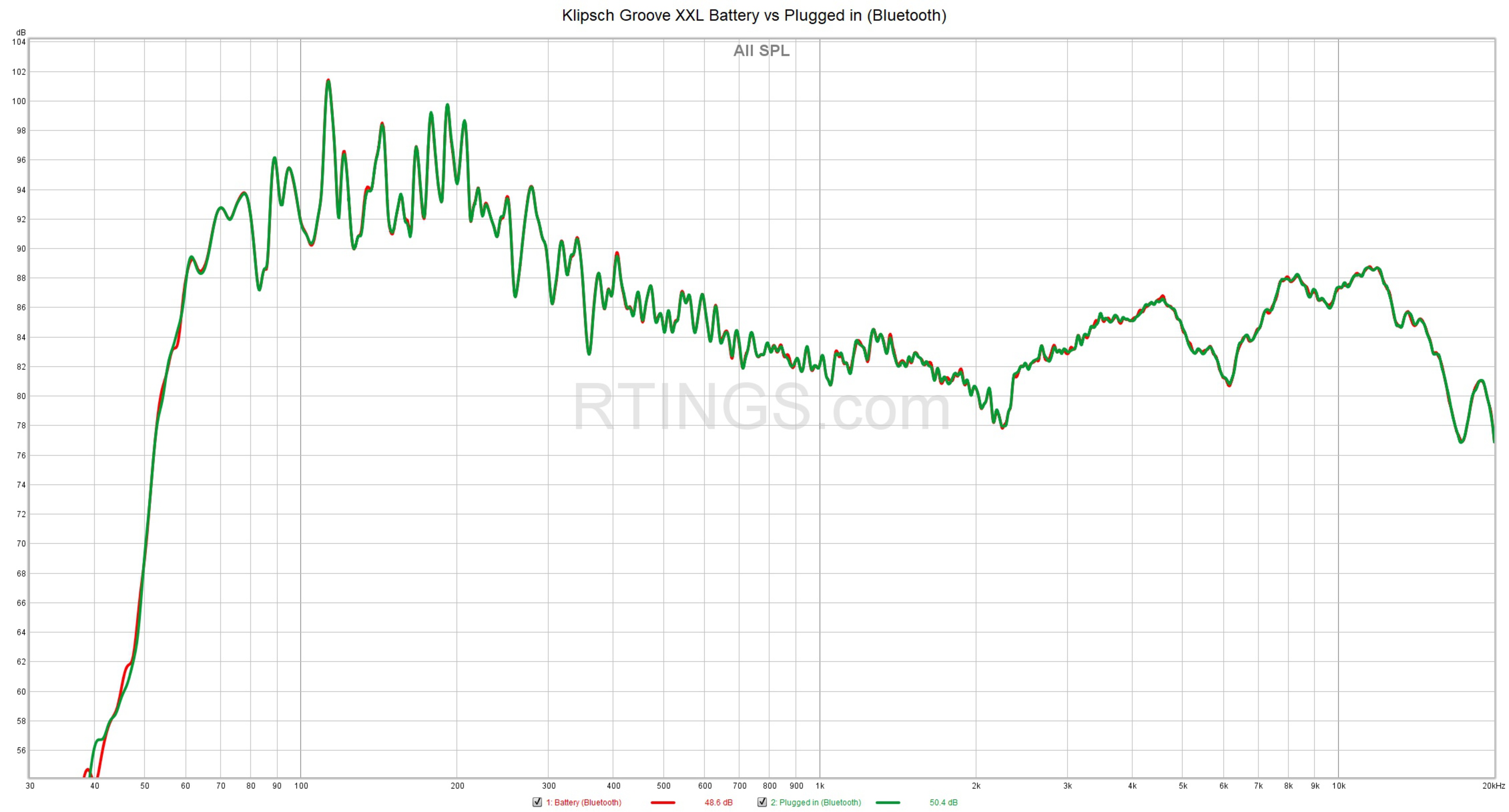 There's no real difference in the frequency response when you use the speaker over a wired connection or on battery power, as shown in the graph here. Similarly, you enjoy the same sound regardless of whether you're connected over AUX or Bluetooth, as seen in this graph.