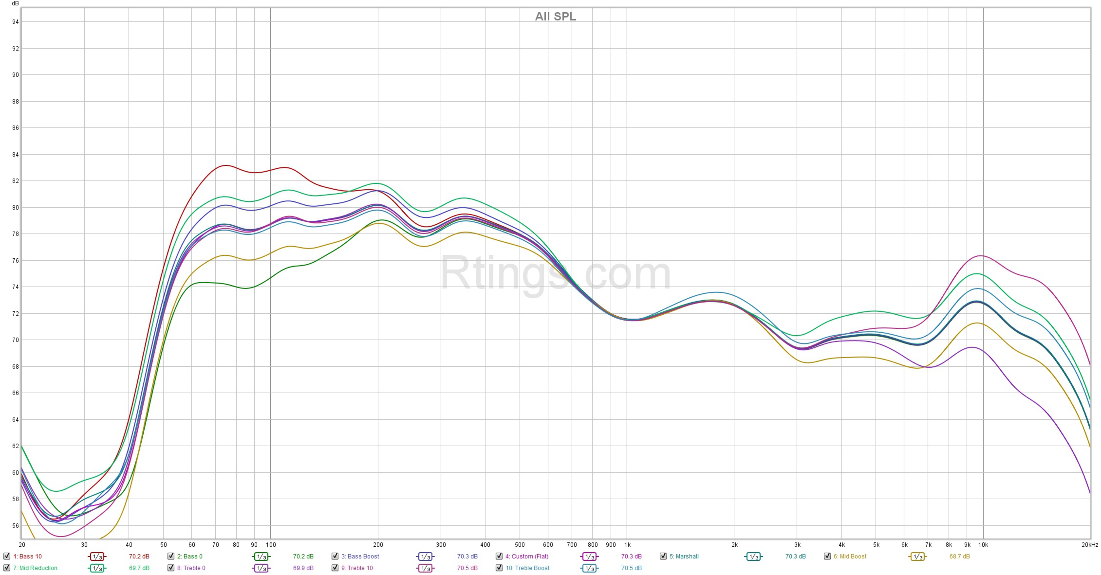 You can use the placement compensation function via the app to compensate for any reflections caused by being close to a wall or an edge; however, we didn't utilize this for our frequency response results, as we placed the speaker in the center of a table in the middle of the room. This graph demonstrates how these settings affect the frequency response in this positioning. We also took measurements with the edge setting enabled, with the speaker positioned at the edge of the table. The app also offers a variety of EQ presets, which can be further customized using the 'bass' and 'treble' controls. So if you enable the 'Bass Boost' preset, you can increase the bass even further by cranking the bass knob.