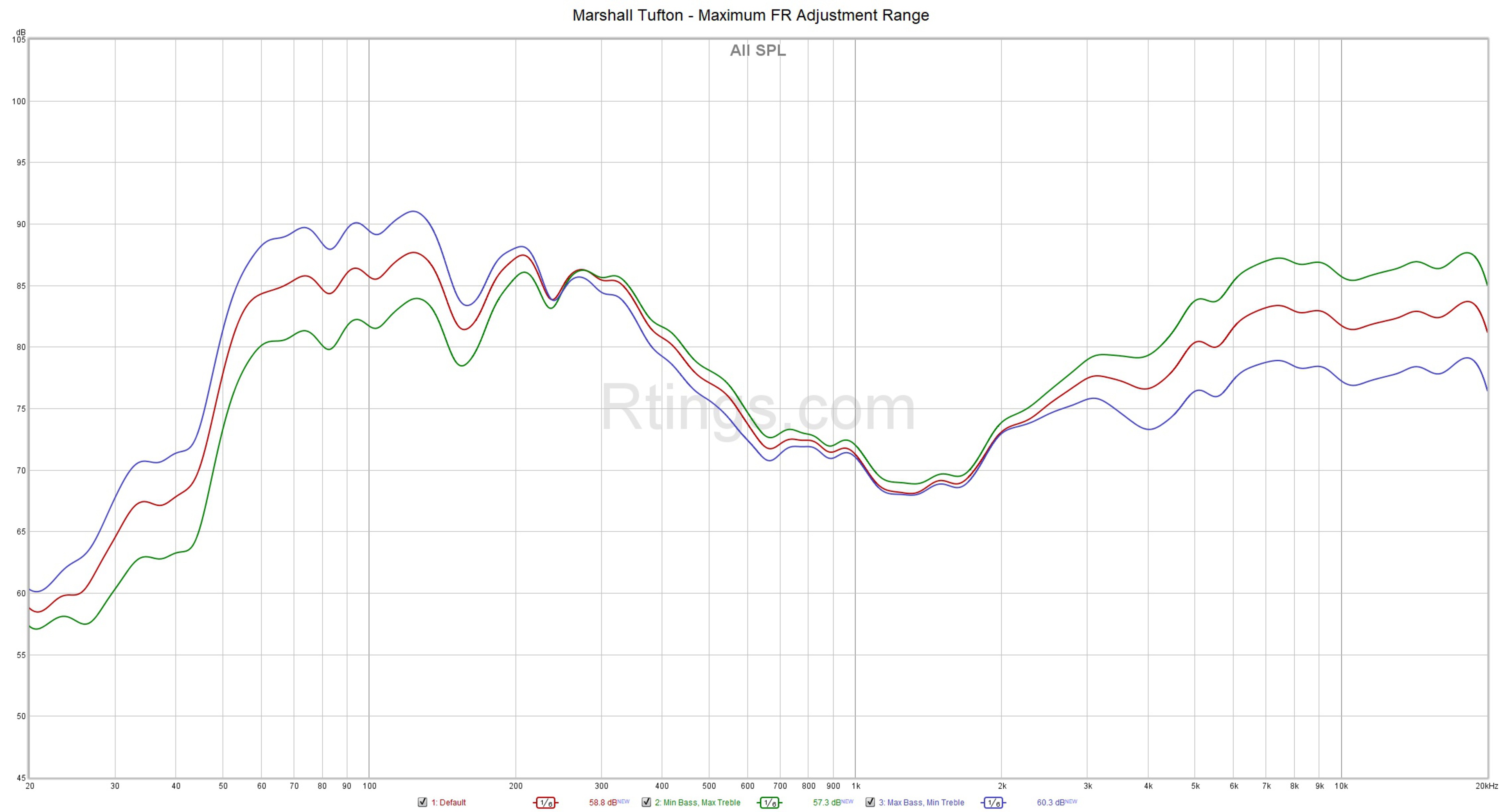 The Marshall Tufton's frequency response accuracy is not bad. It uses a subwoofer, two full-range drivers (one of which is facing the back of the speaker), and a tweeter. With the bass and treble knobs both set to five (out of 10), it has an extreme V-shaped sound profile with elevated bass and treble ranges and recessed mids. The boost throughout the bass range results in a deep, boomy sound, while the heightened treble adds plenty of brightness but can also verge on harsh and piercing. Meanwhile, the recessed mid-range means that vocals and lead instruments can sound distant and lack clarity.