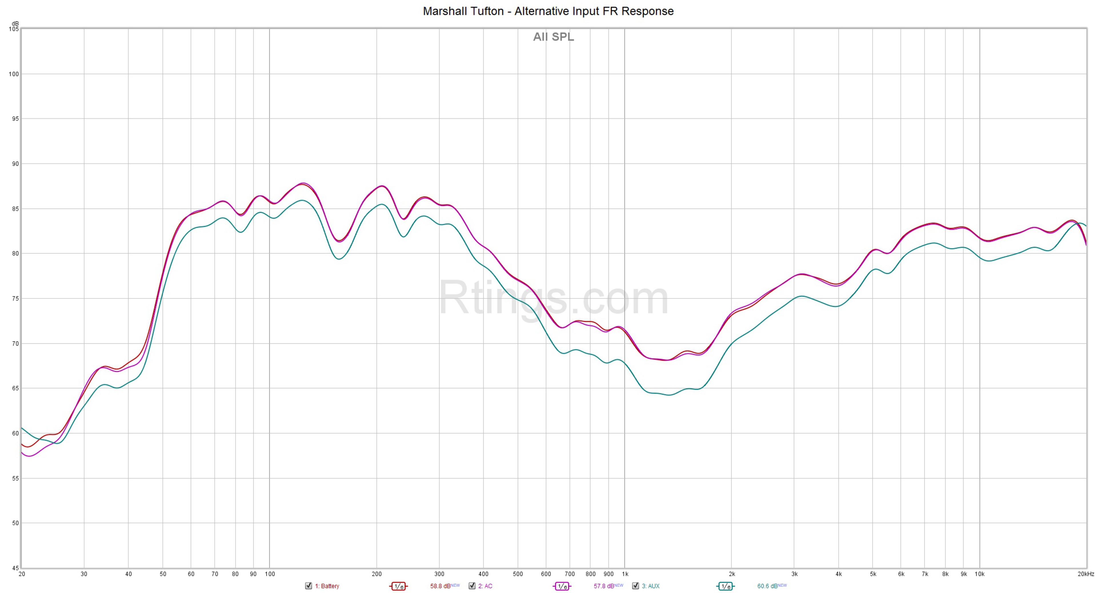 The speaker displays a V-shaped sound profile even when the bass and treble knobs are set to their minimum values. Unfortunately, there's no additional EQ available to tweak the sound further. At maximum volume, this response flattens out a bit, though. You may also notice a slight change in frequency response depending on which input you use.