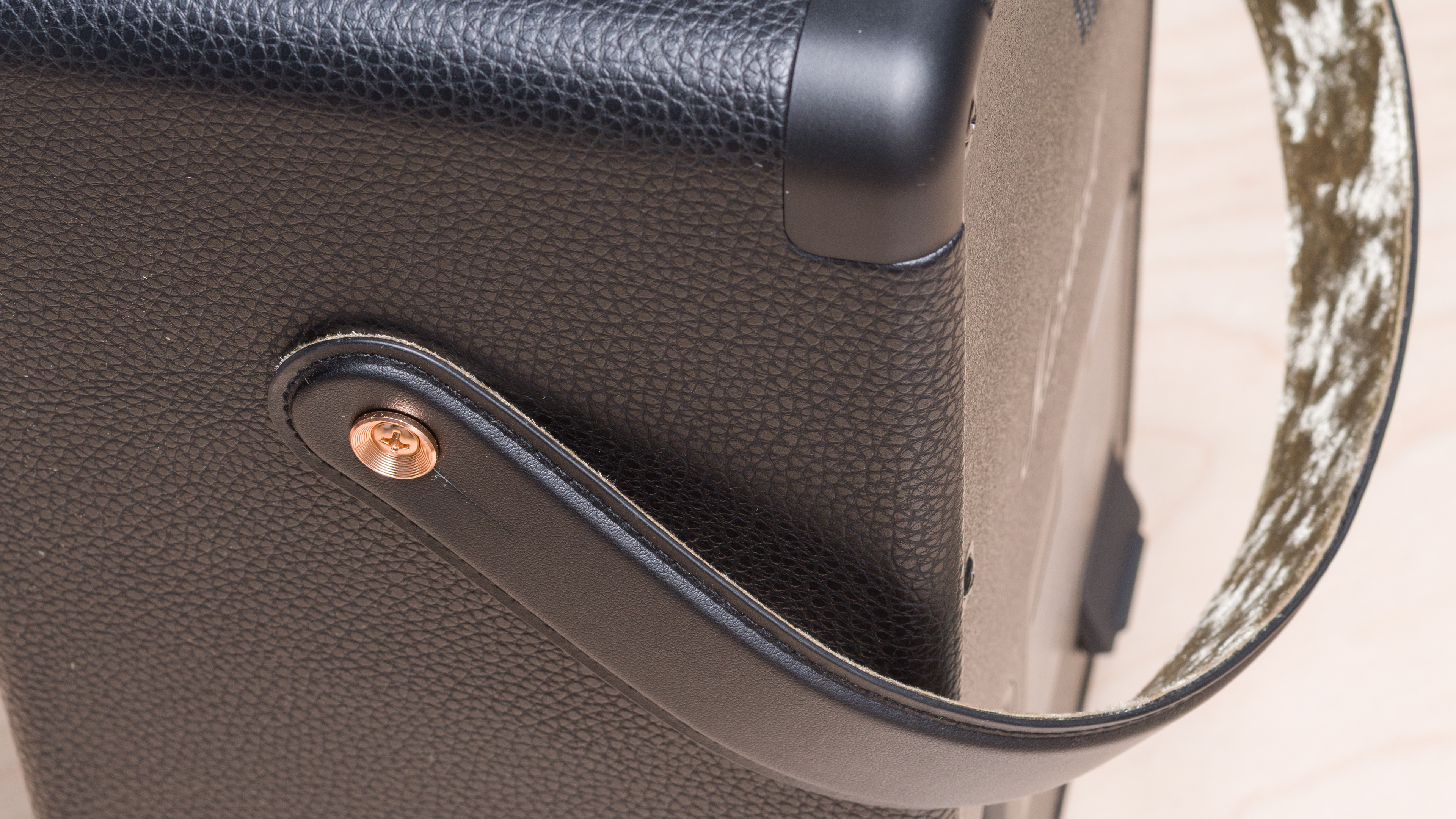 Like other offerings from the brand, the Marshall Tufton speaker has a stylish retro design. This speaker, in particular, is modeled after music industry gear with an amp-like body and guitar strap-inspired handle. It has a tall frame with a metal mesh grille covering the drivers, and it's finished in leather-textured plastic, which mimics the Tolex covering on many guitar amps. You can find it in either 'Black' or 'Black and Brass,' like our unit, which has brass controls and accents.