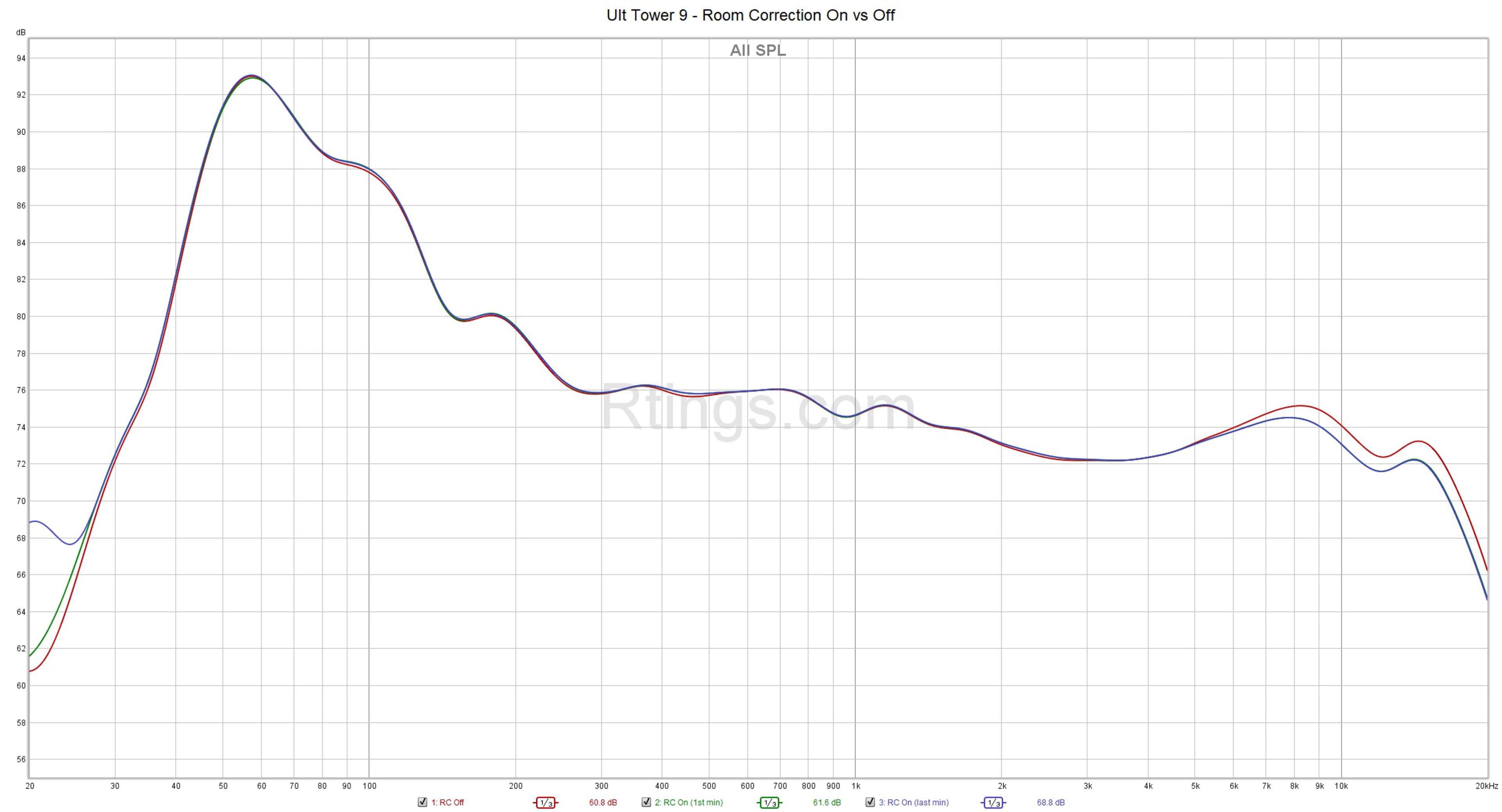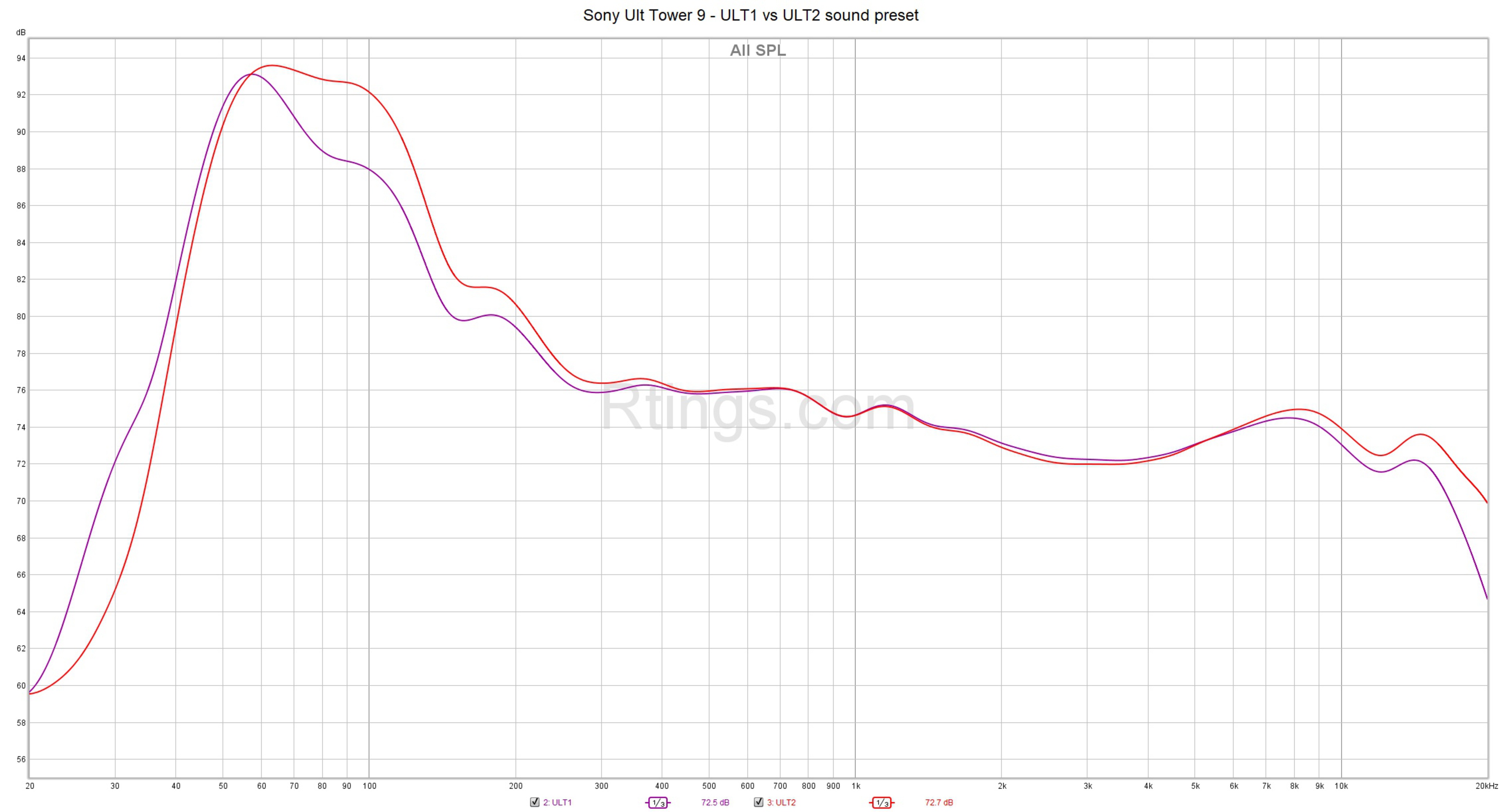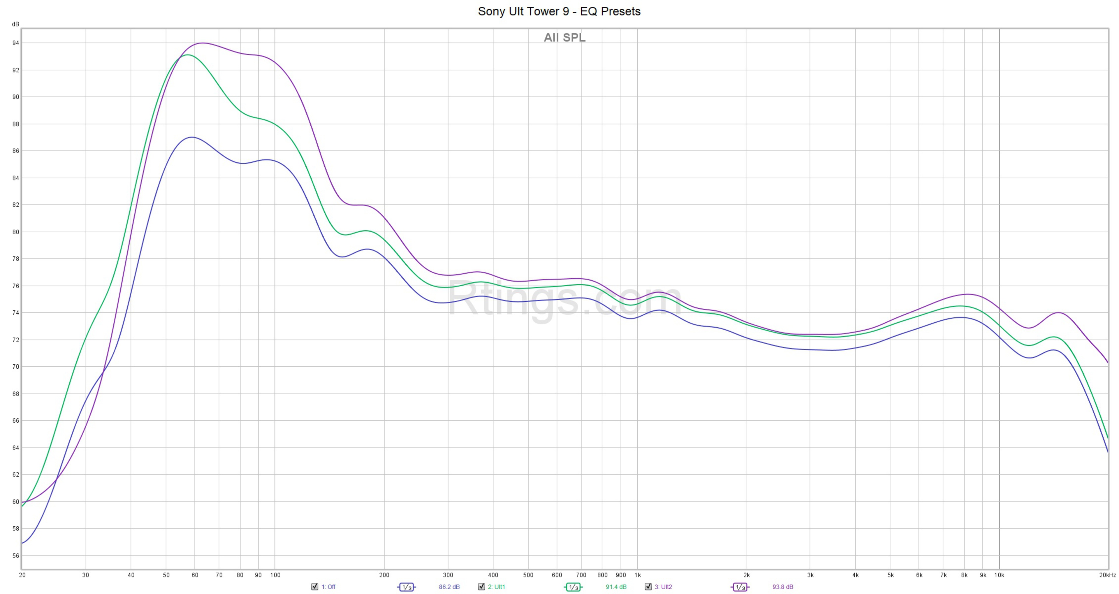 The graph shows the Bluetooth connection's response with the room correction, Sound Field Optimization enabled (though we didn't find a meaningful difference with it off), and set to the 'ULT 1' preset mode. By default, the speaker is set to 'ULT 2'; however, we found that this preset is substantially more boomy and muddy in the bass and low-mids, and 'ULT 1' matches our target frequency response more closely. Each 'ULT' mode also causes a jump in output volume compared to leaving it off. We also found that the speaker sounds the most accurate when it's placed vertically and on the floor, as opposed to on a table.