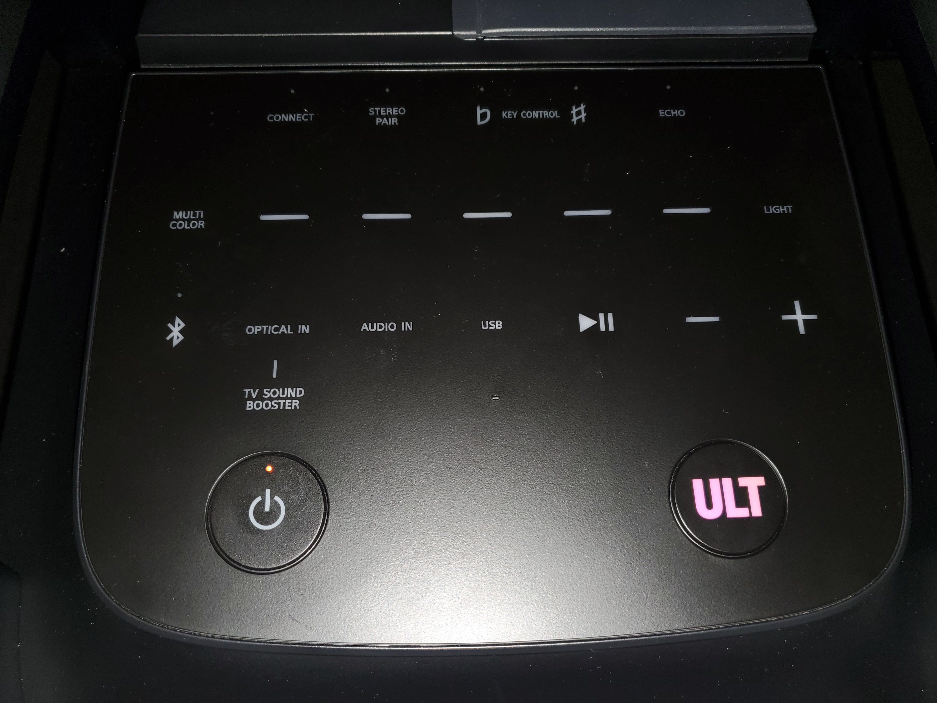 The controls are straightforward, labelled, and intuitive, which you can explore here. Many settings are instantly accessible without relying on the app, like playback, input selection, Stereo and Party modes for additional speakers, karaoke controls, and RGB lighting. A mixture of light indicators and chimes and a voice prompt alert you for functions like Bluetooth pairing, connection statuses for Bluetooth, as well as Party and Stereo modes. Each time the 'ULT' button is pressed, the speaker emits a chime, so you know it registered. Rather than chime with each command, the speaker uses lights to indicate the current input selection, volume changes, and min/max volume, and whether features like echo are on. If left idle for 15 minutes, it'll silently power off without any audible warning, and some of the dedicated light indicators are a bit small, which might be hard to see in some settings.