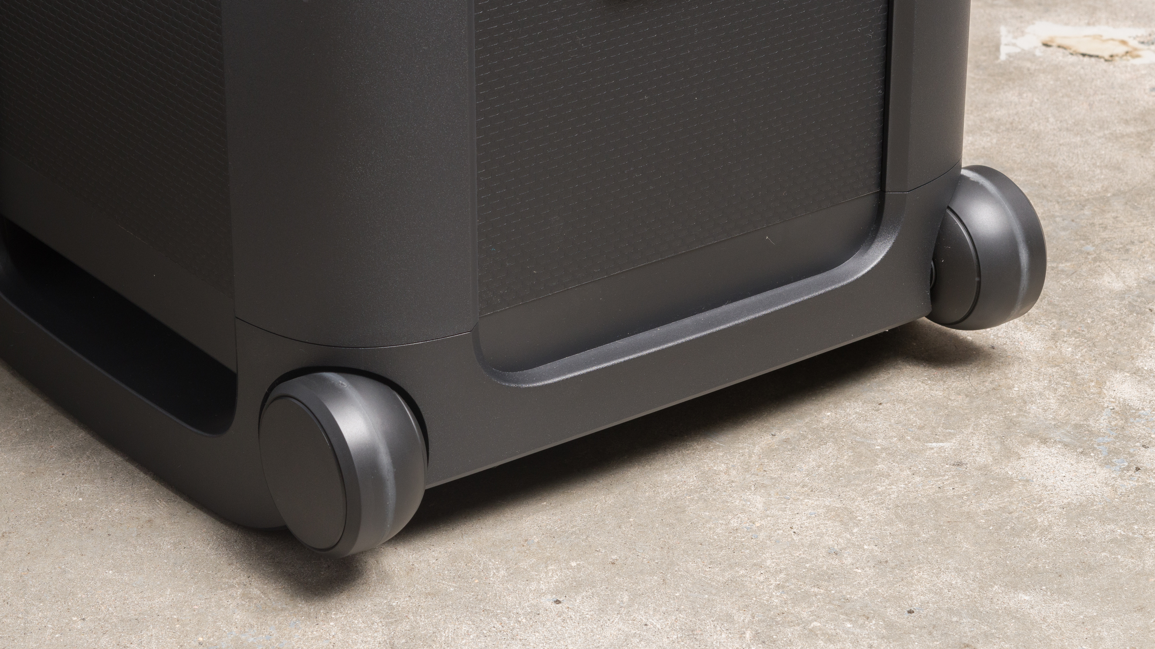 The speaker's build quality is not bad. It's mainly made of sturdy plastic, some of which is recycled, according to the manufacturer. The grille is perforated metal to protect the drivers, and the underside of the speaker has slip-resistant rubber feet. Two small wheels are suitable for rolling the speaker over flat surfaces, but they're hardly meant for rugged terrain. Suggesting that the speaker isn't meant to travel far, the handle, which is simply the top of the frame, is a bit slippery and lacking any extra grip, and it requires that tall people crouch and short people use a more acute angle to move the speaker.