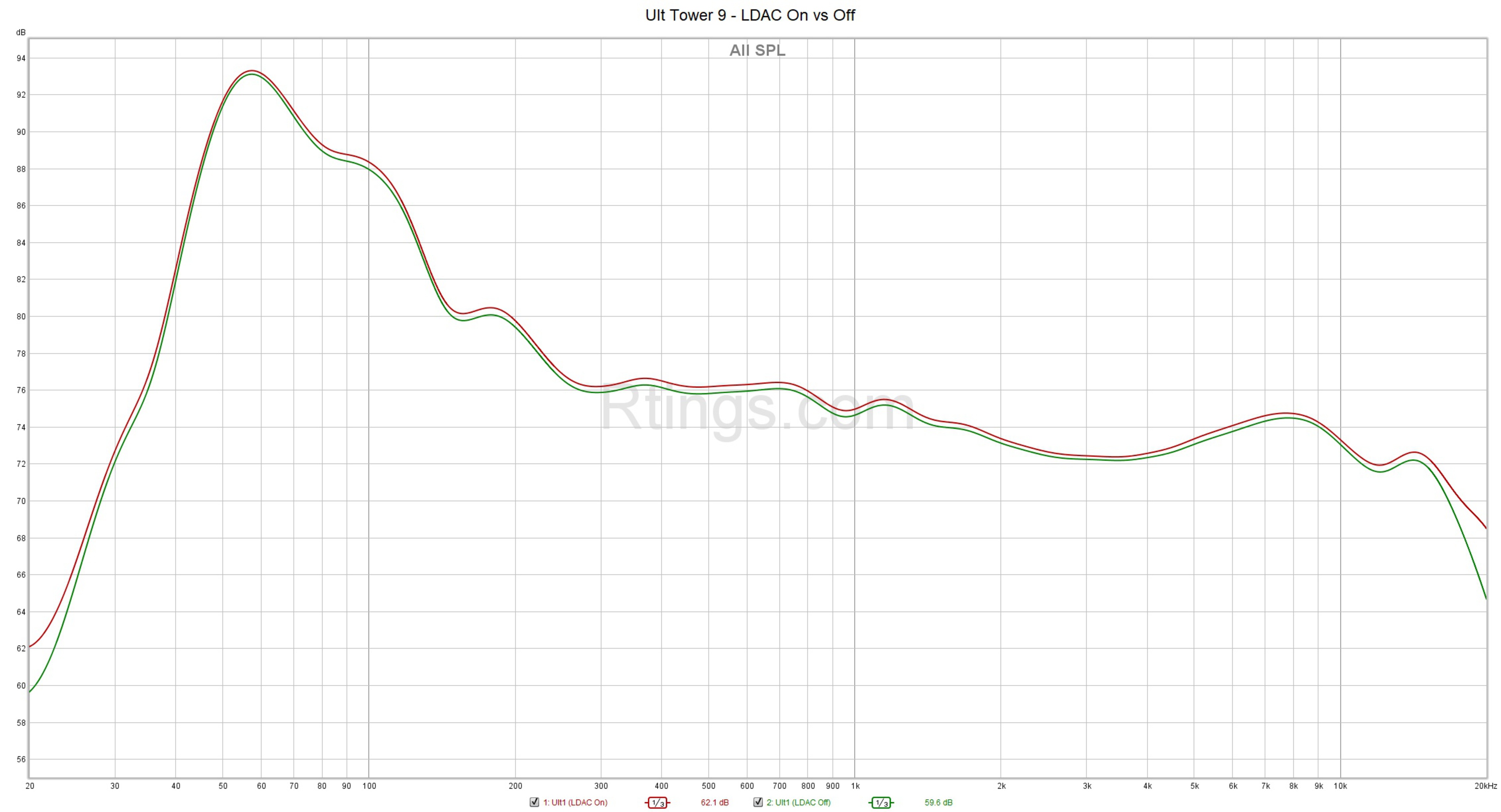 The Sony ULT TOWER 9AC has very good frequency response accuracy. Like the rest of the ULT range, including the headphones like the Sony ULT WEAR, this speaker emphasizes the low-end. The frequency response injects extra thump and weight on kick drums and basslines in tracks like Charlie's Comet by Mandrake Handshake; meanwhile, the fairly even mids offer lead electric guitar breaks, melodic keys, and saxophones plenty of room to cut through for the most part. Due to the lower frequency emphasis and slightly de-emphasized treble, busy mixes may have slightly diminished clarity when it comes to vocal articulation. Unsurprisingly, it doesn't matter which Bluetooth codec you use (LDAC vs SBC); it doesn't meaningfully affect the frequency response. For a more neutral tuning with deeper lower frequency extension, check out the JBL PartyBox 520.