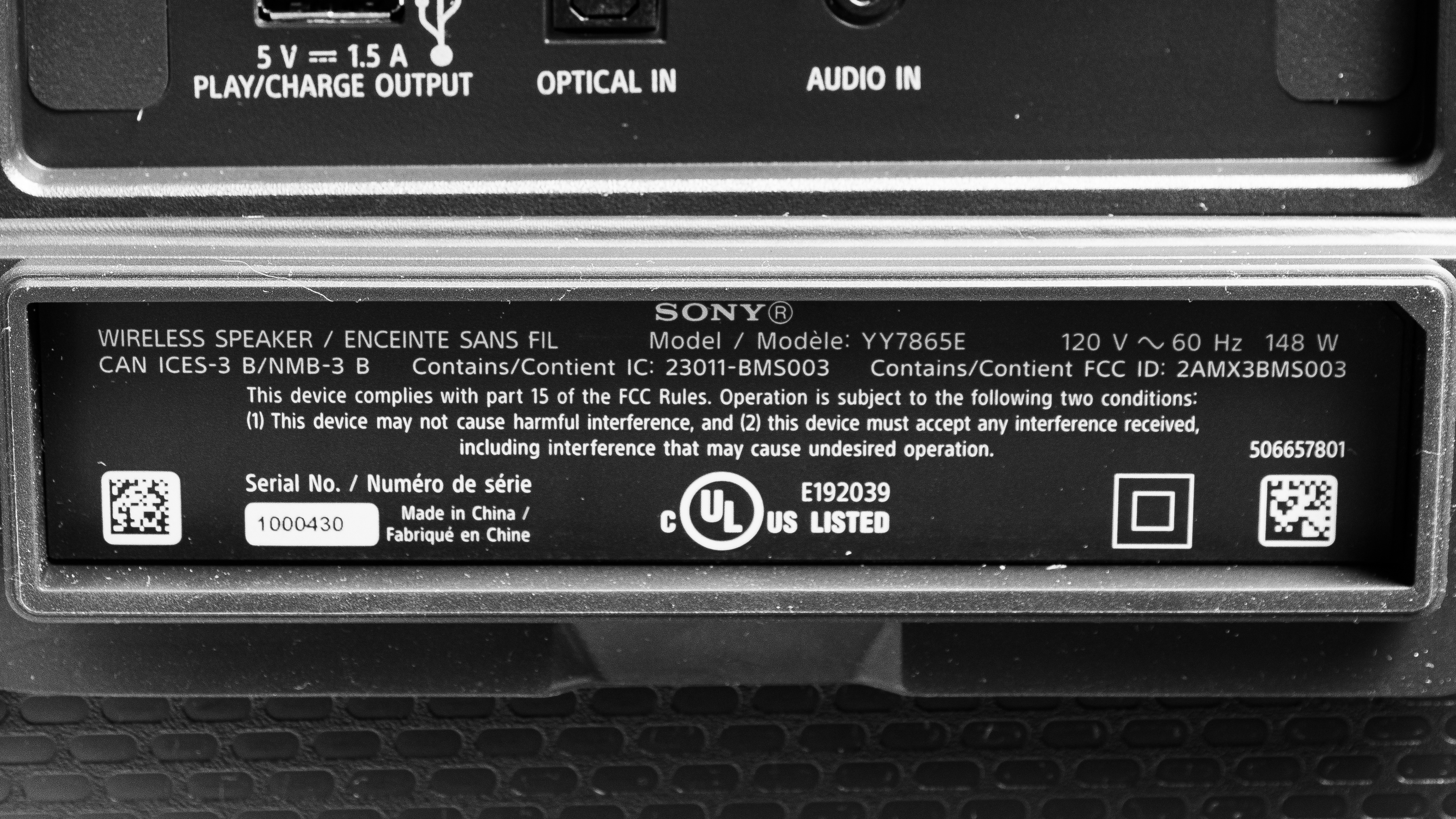 The Sony ULT TOWER 9AC only comes in one color, 'Black.' Here's a photo of the label for our unit. There's a battery-powered version called the Sony ULT Tower 9 (without 'AC'), and while we expect some functions are similar, like the app and controls, other performance metrics may vary from the AC model, so our results are only valid for our unit.