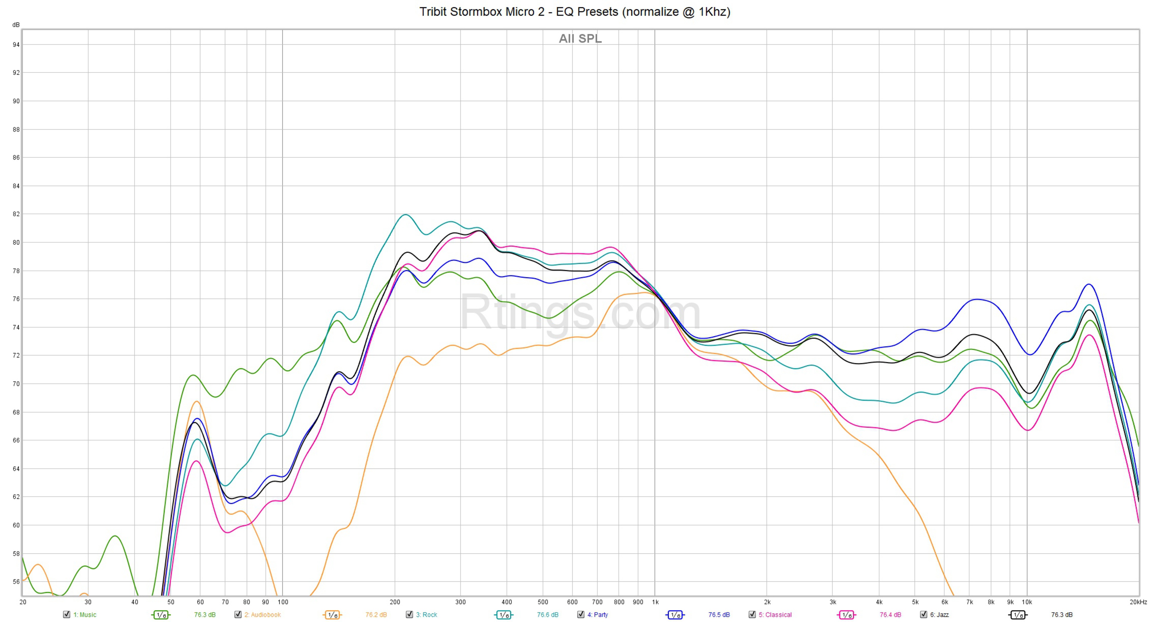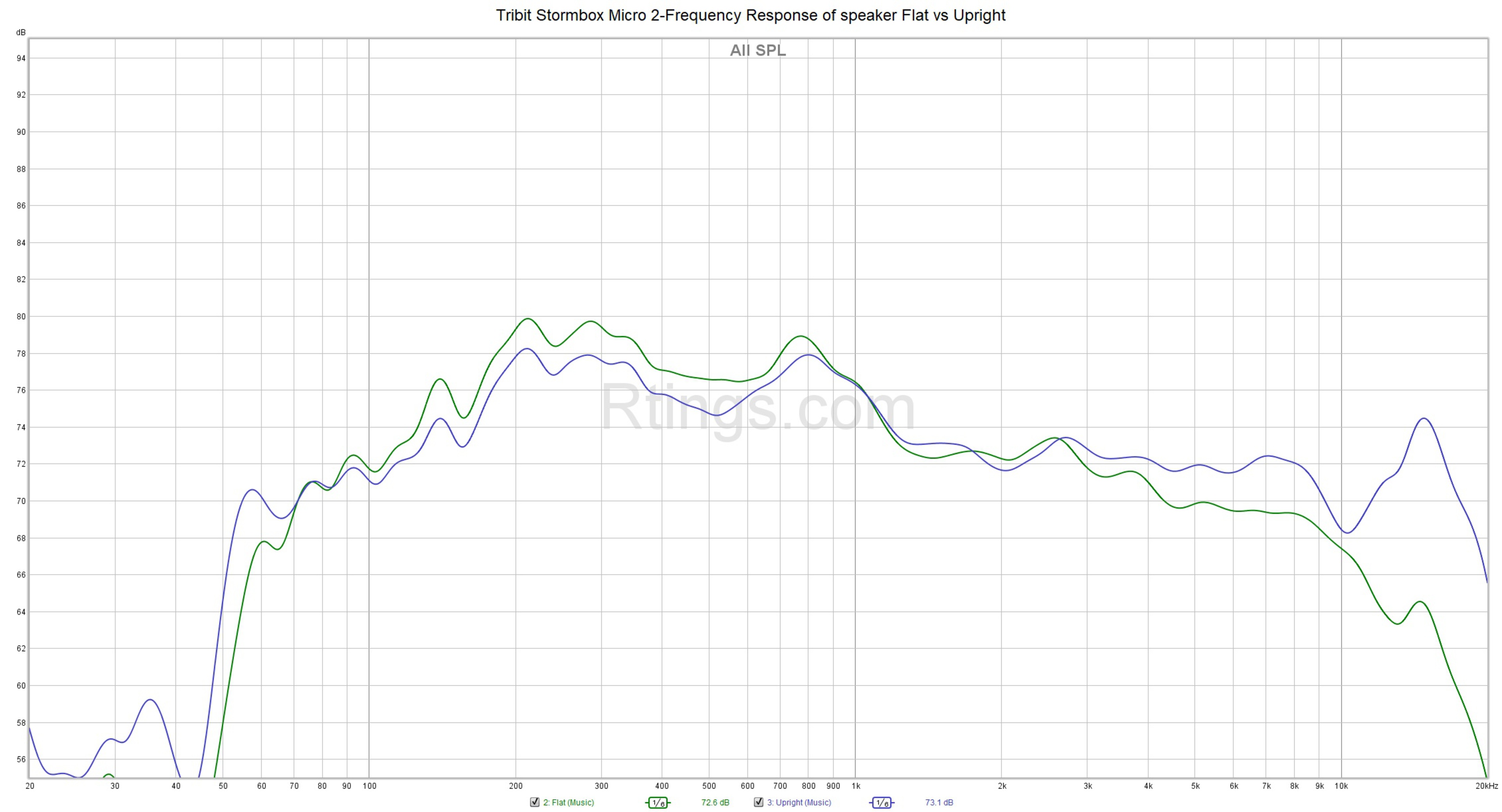 The Tribit Micro 2 has middling frequency response accuracy. Since it's a very small device, it doesn't produce much bass at all, so don't expect this to get a techno party started. That said, there's enough high-bass to keep basslines audible. The mid-range is well-balanced, so instruments and voices sound accurate and true-to-life. The treble is also reasonably well-controlled. It's ever so slightly recessed, but since this speaker produces little bass, that helps to ensure your audio doesn't sound too bright. You can also adjust the sound to taste via a 9-band graphic EQ in the companion app. We measured the effect of various EQ presets on the sound of this speaker when in an upright position.