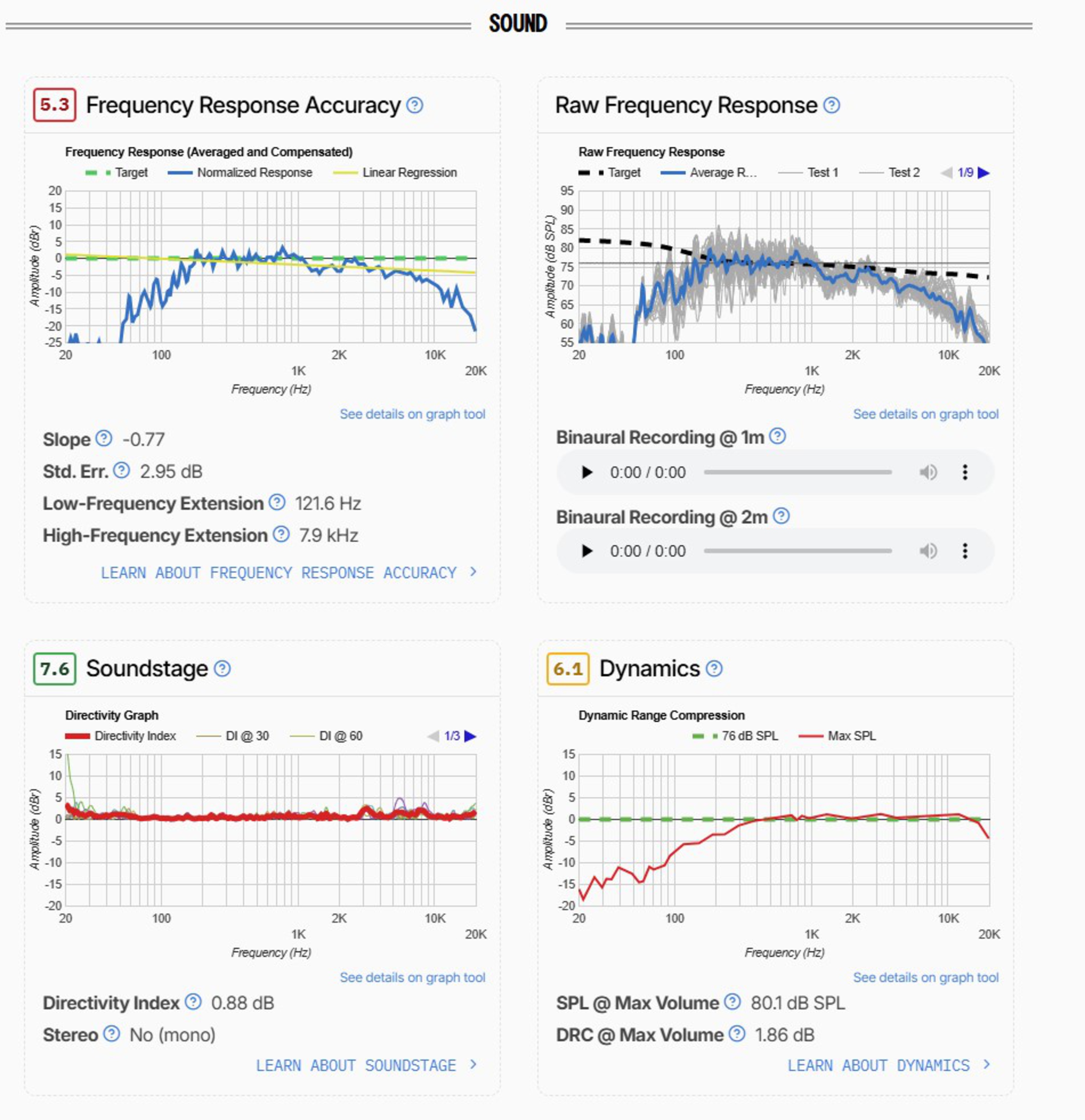 We tested this speaker in an upright position because that produced a more balanced frequency response than it did lying on its back. That said, as you can see in the Soundstage box, the speaker has better directivity when on its back. It's also worth noting that although there is a peak on the frequency response graph at 58.2Hz, this isn't audible with regular content.