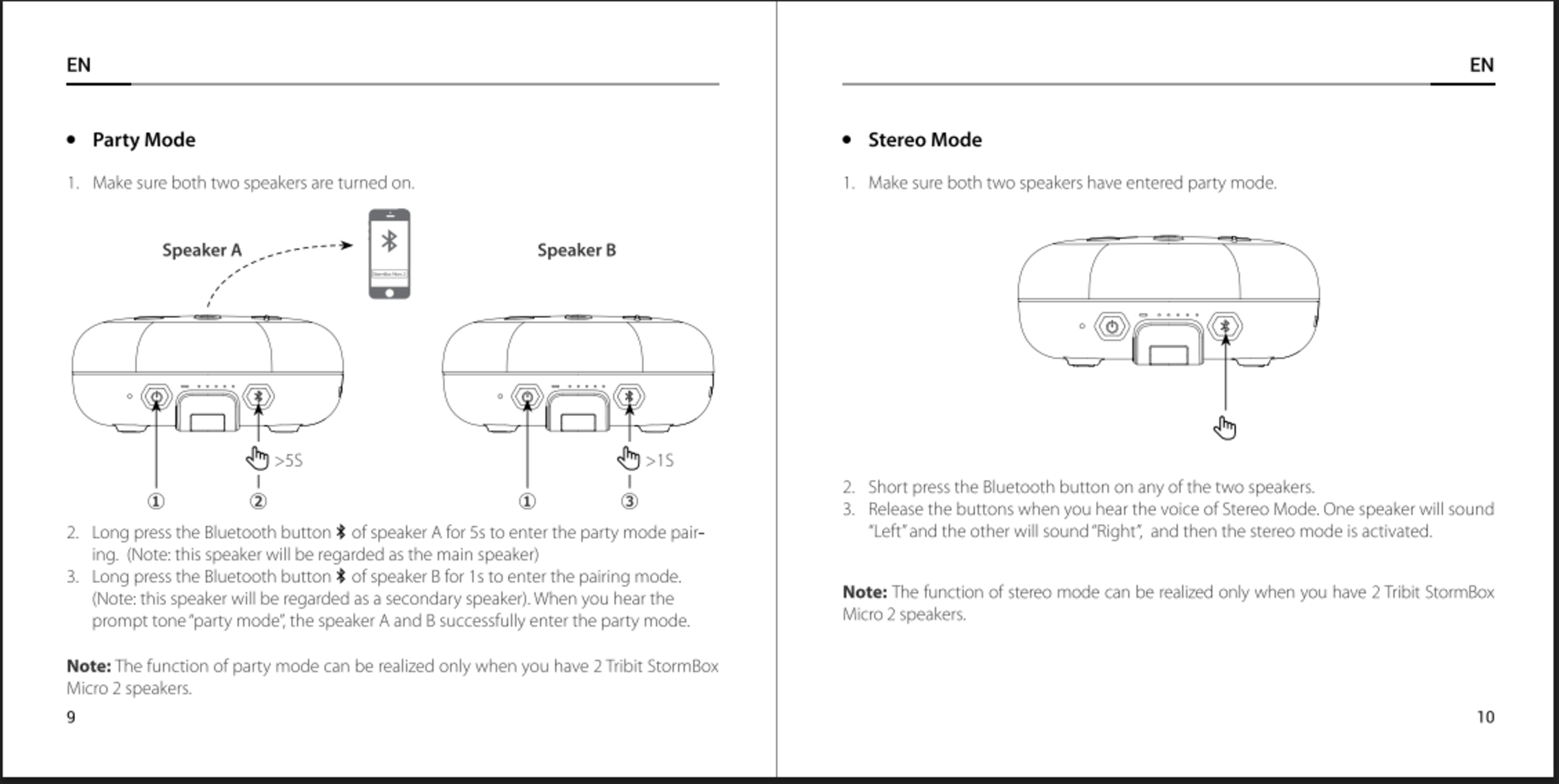 The power and Bluetooth buttons are located on the side of the unit. You press and hold the Bluetooth button to enter pairing mode, and once paired, the Bluetooth LED turns solid blue. You can also use the Bluetooth button to pair the speaker with other Stormbox Micro 2 units for stereo playback or Party mode.