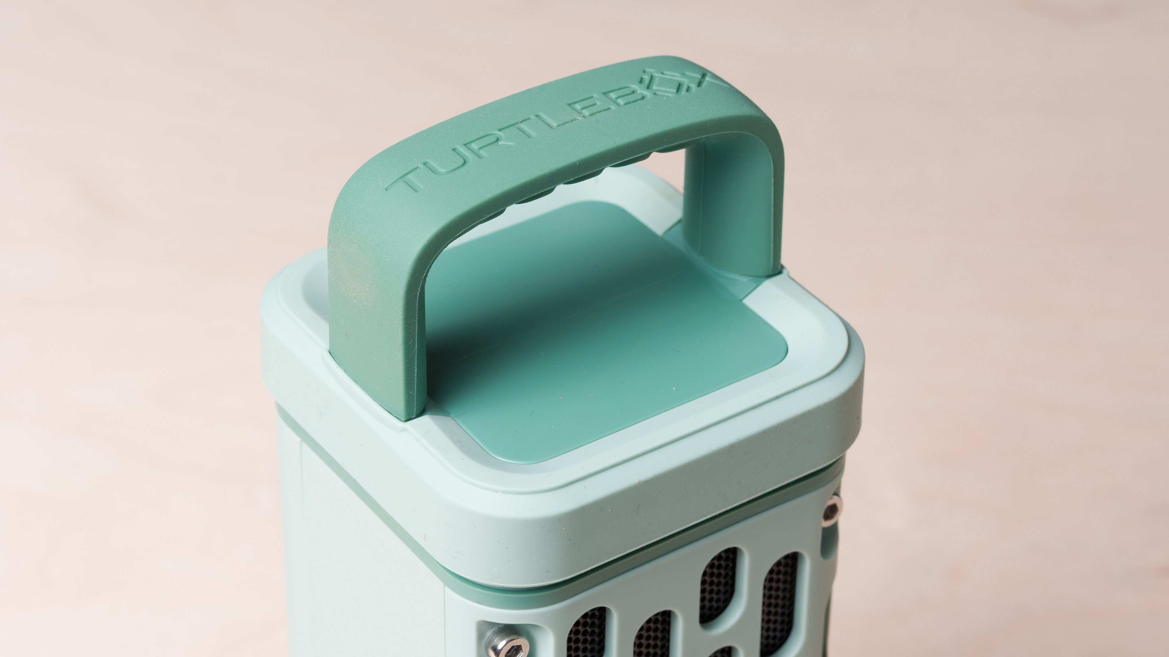 The Turtlebox Ranger has a unique design that looks reminiscent of a slim lantern, complete with a prominent handle at the top. It comes in several colorways, spanning a subtle 'Gray' to a hi-vis 'Orange.' Our 'River Rock' model is primarily a pale, seafoam-green-meets-hospital-scrubs shade with tonal detailing. Grey mesh peeks out from underneath the enclosure, and the branded logo runs down the front in red. Flaps for ports and strap handles are hidden around the slightly chunky, but not overly cartoonish, overbuilt corners and angles of the speaker. You can use the speaker upright or horizontally, with controls residing along the speaker's side when placed in the vertical orientation.