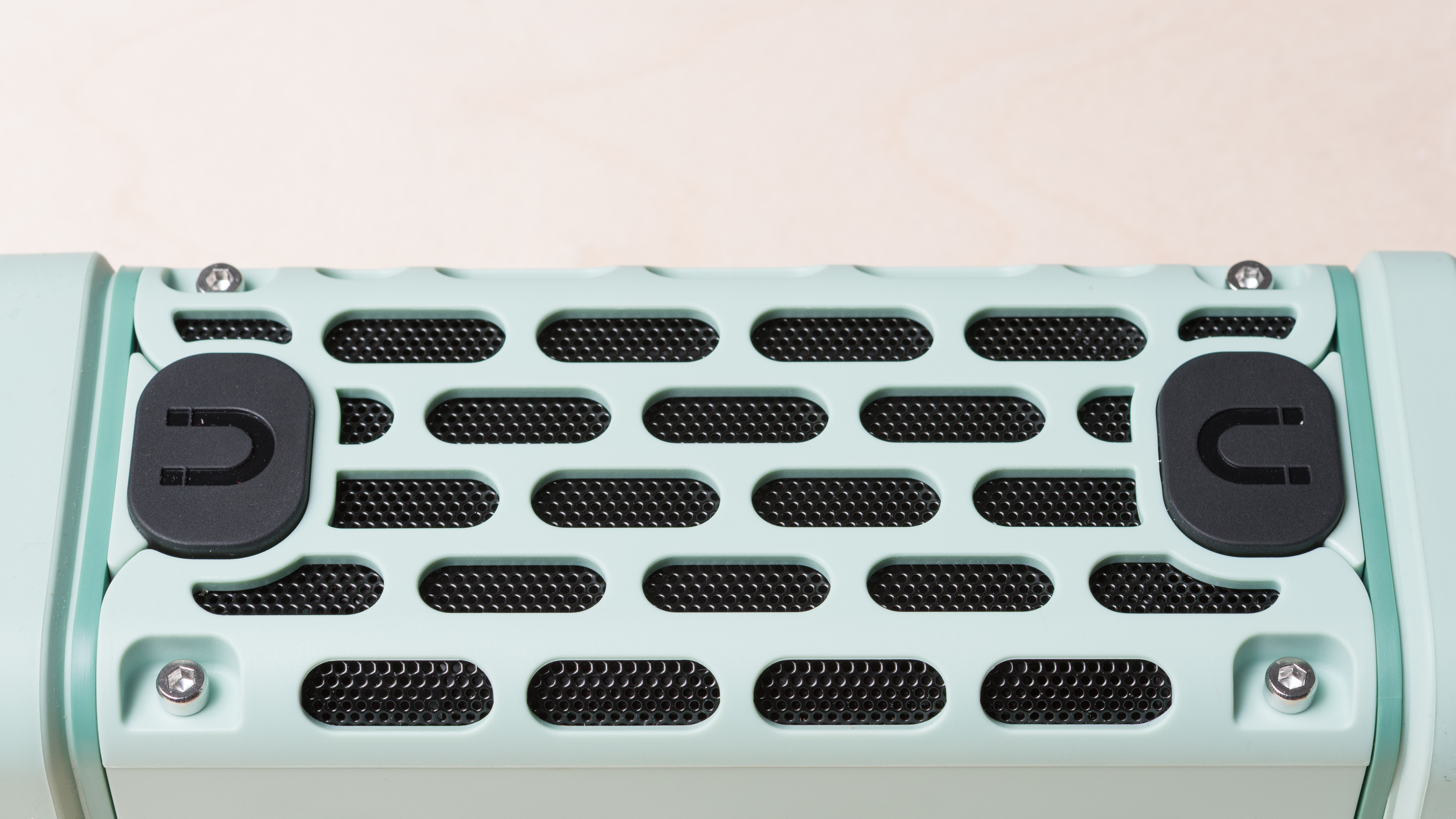 The top of the speaker (when vertically oriented) has a relatively large handle, and the bottom has a metal tie-down bar so you can tie it down if you place the speaker on its side. Adding to that, two magnets on the back can secure the speaker to metal surfaces, like a golf cart or truck bed. More on security, the speaker includes removable anti-slip rings, which also help protect the speaker if it's battered around.