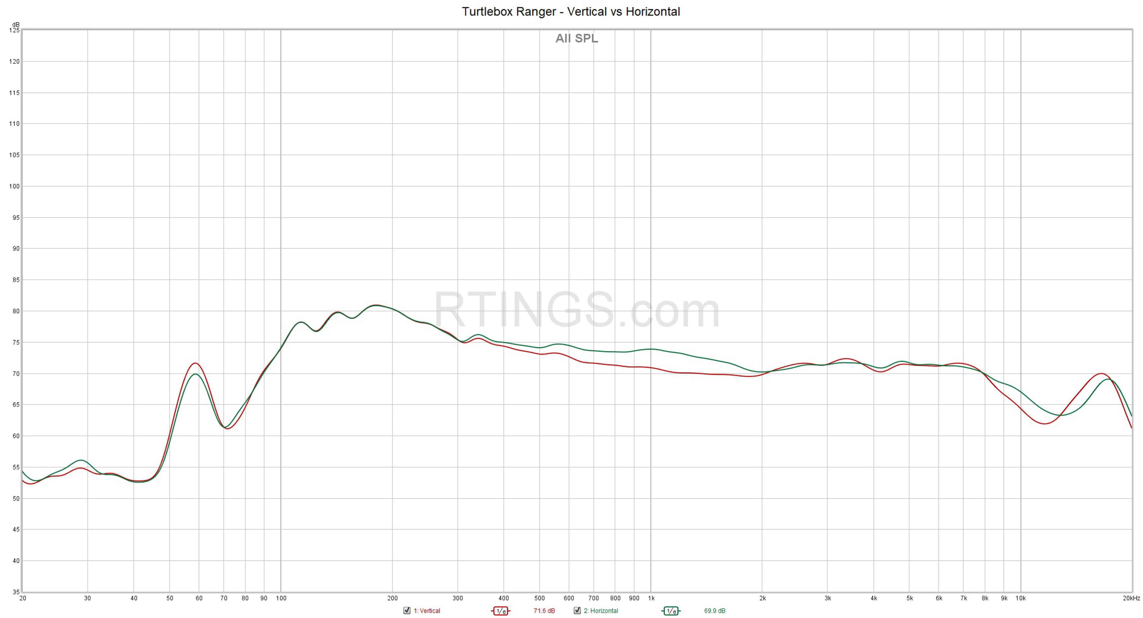 As with most smaller speakers, the Turtlebox Ranger doesn't have a deep bass, but it outputs a healthy boomy emphasis in the high-bass region to slightly offset the low-end roll-off. The mid-range adheres more closely to our curve without dramatic peaks and valleys, which conveys dialogue and melodies evenly. Besides a sizeable dip in the high-treble, which can make your audio sound more closed-off and lacking airiness, the low and mid-treble regions sound a little dark, and slightly warm, but retain most of the detail of sibilant sounds like cymbal hits. Since the bass rolls off, it can sound relatively harsh if there's treble emphasis, so the de-emphasis can help you avoid ear fatigue. Unfortunately, there's no EQ if you want something different.