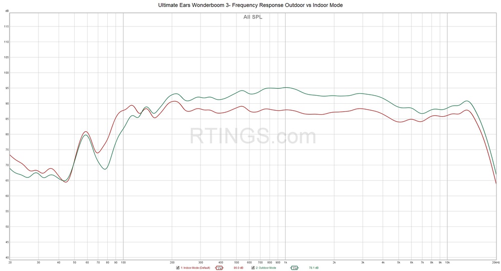 Also, like the WONDERBOOM 2, it doesn't come with a graphic EQ to customize its sound to your liking, and there's an 'Outdoor' mode button underneath the speaker that makes audio sound a bit crisper for when you're outdoors. We tested both the frequency response accuracy and the SPL using this mode and noticed there was a slight increase in volume, coupled with boosts to the mid and treble ranges that brought out vocals and speech. The bass range was reduced, presumably because bass frequencies struggle to carry in outdoor situations anyway due to their wavelength and the lack of reflective surfaces.
