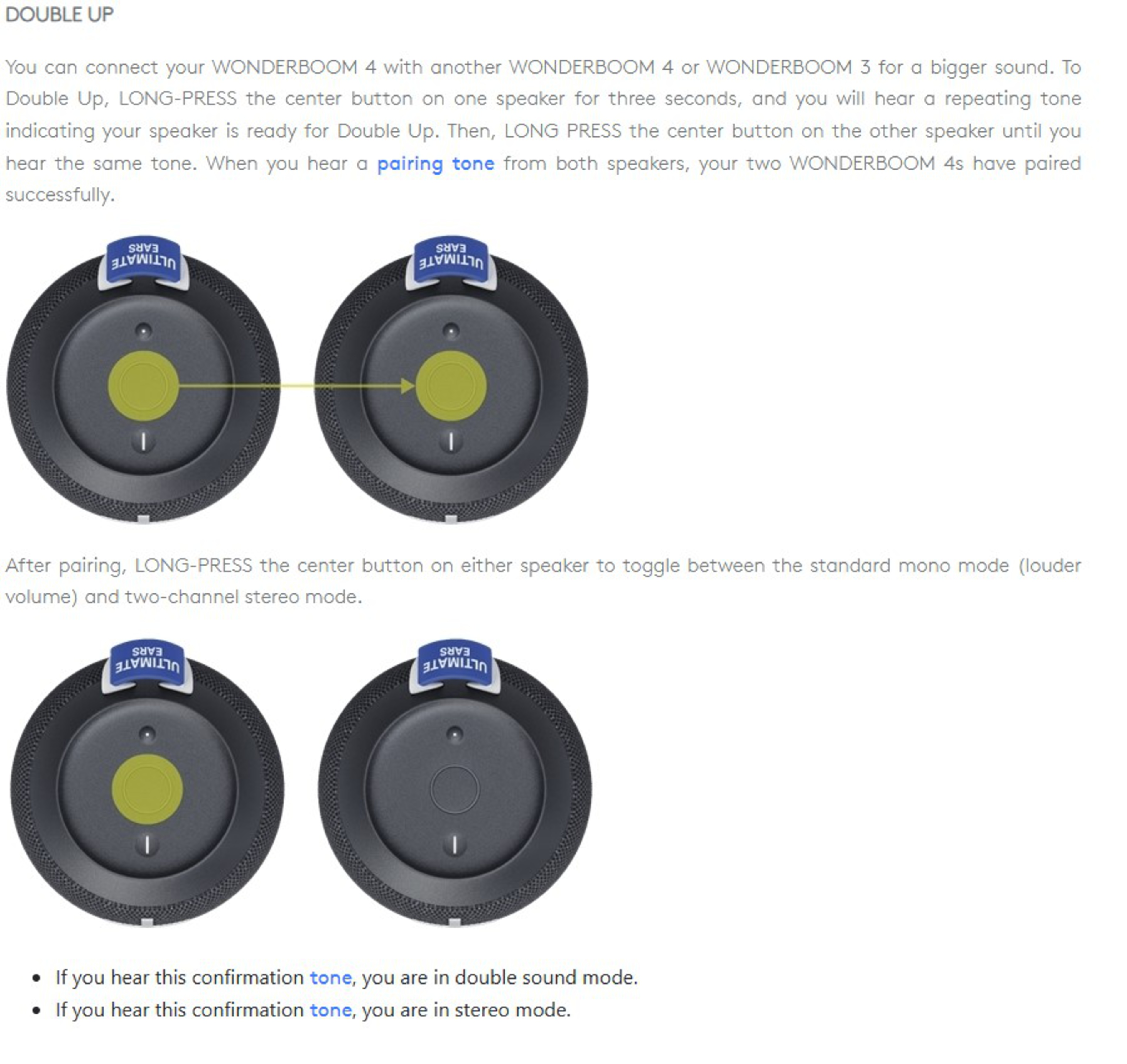- Press and hold: Connect with another WONDERBOOM 4 or Ultimate Ears WONDERBOOM 3 speaker and switch between stereo and mono modes.