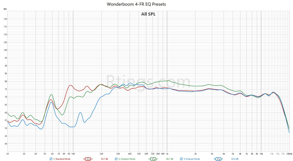 Unlike its predecessor, it has a 'Podcast' mode in addition to the 'Outdoor' mode found on the last generation model, which we expect to perform similarly on both generations. 'Podcast' mode de-emphasizes bass so that speech is easier to hear. 'Outdoor' mode creates a more excited and brighter sound profile. You can see the graphs for the 'Podcast' and 'Outdoor' mode comparison to the standard tuning.