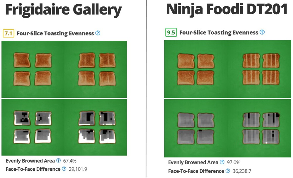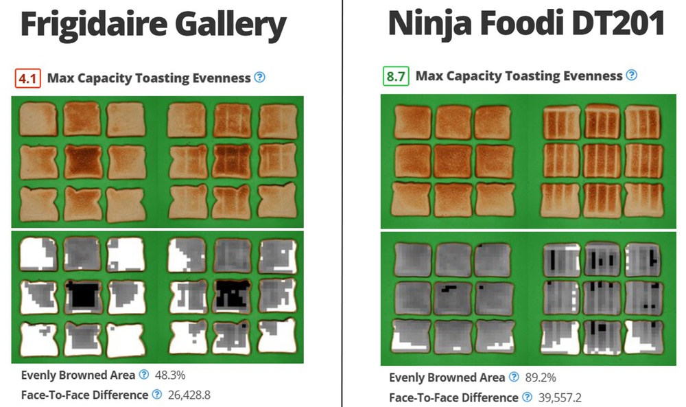 In terms of speed, the Frigidaire is not far off the Ninja which does slightly better. However, keep in mind their power differences — the full-size oven has 4000 watts of power to work with, while the Ninja only uses 1600 watts when toasting. Despite the Frigidaire having a 250% power increase, it takes 11.9% more time to make toast. Despite having less power, the Ninja's quartz heaters are more efficient for toasting due to their higher component of radiative heat transfer.