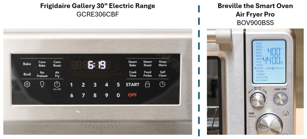 To investigate this ourselves, we purchased a full-size oven, the Frigidaire Gallery 30" Electric Range (GCRE306CBF) — complete with all the bells and whistles, including steam cooking and, you guessed it, an "air fry" button. Our goal was to break down the design differences between the two appliances and then directly apply our toaster oven methodology to see how the full-size counterpart stacks up.