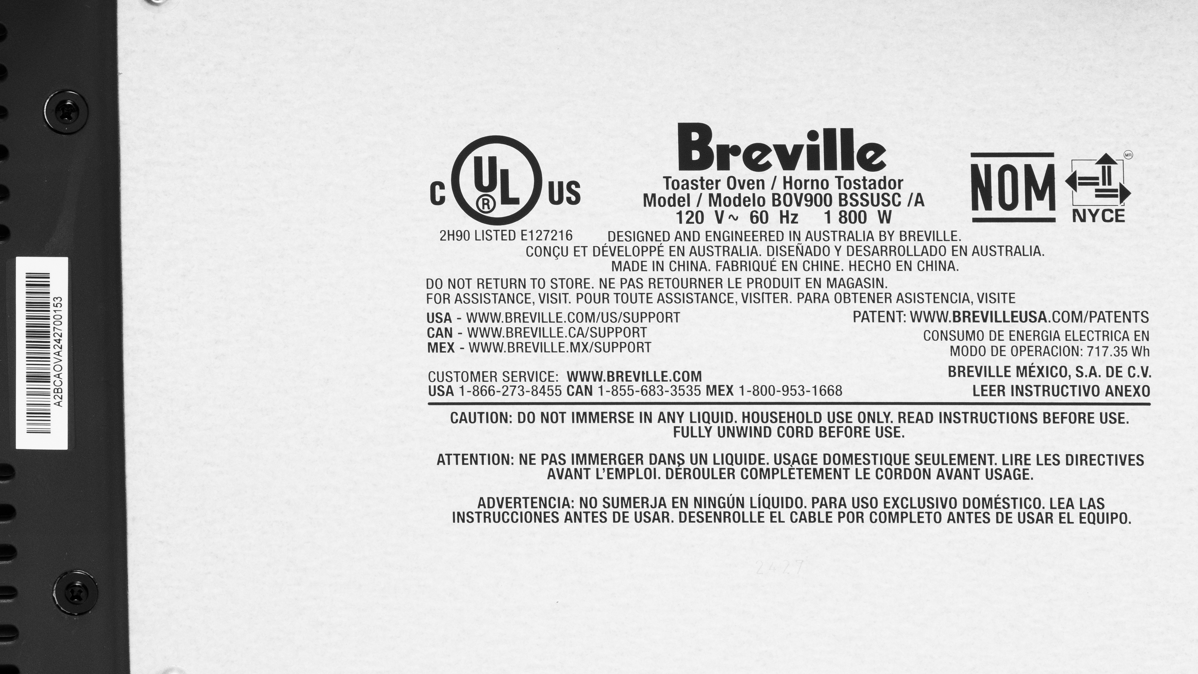 This toaster oven comes in one color variant, 'Brushed Stainless Steel.' Here's a picture of our unit's label.
