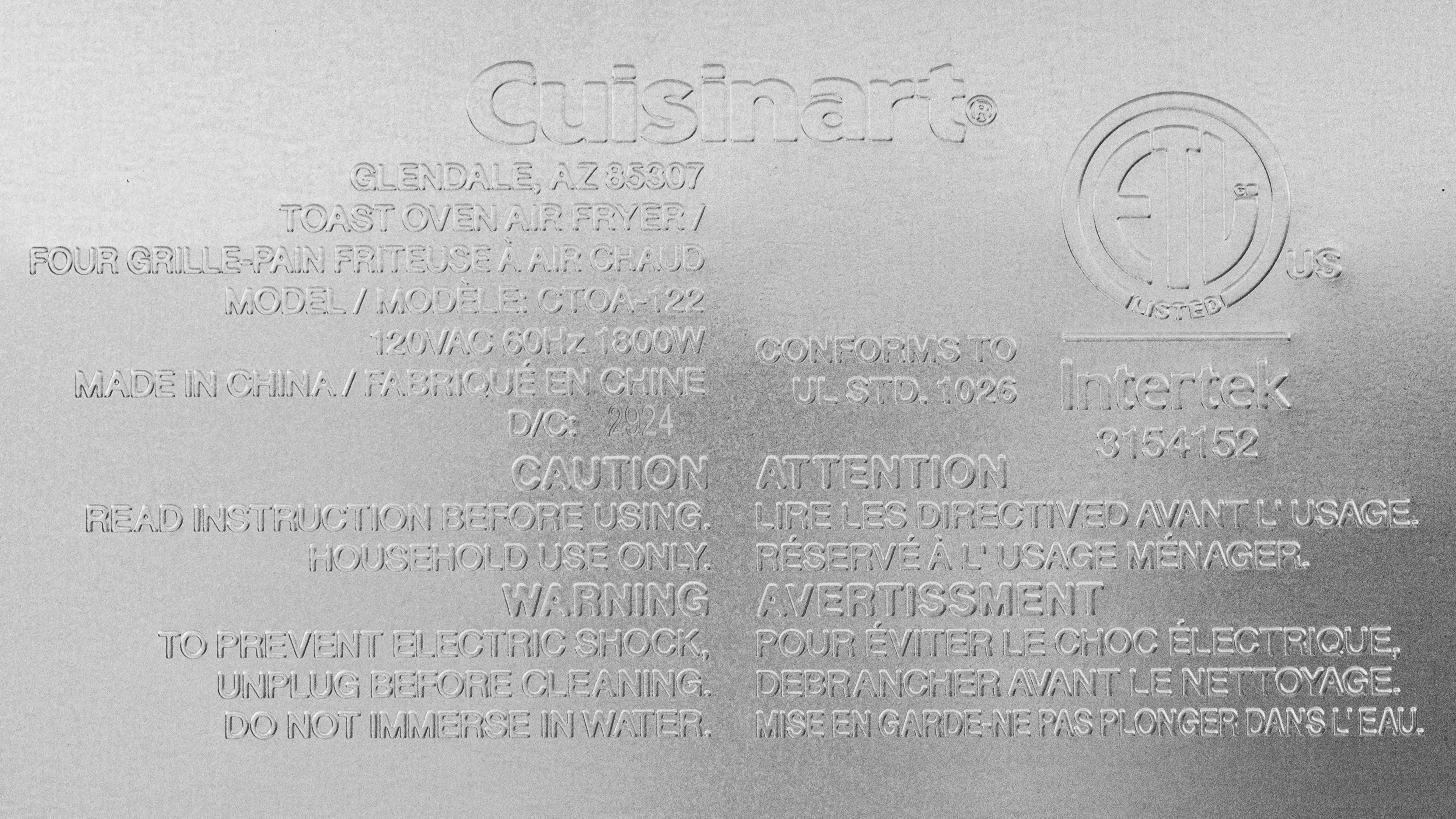 The Cuisinart Air Fryer TOA-60 comes in 'Black Stainless,' 'Stainless Steel,' and 'White' color variants. We tested it in 'Stainless Steel,' and here's a picture of our unit's label.