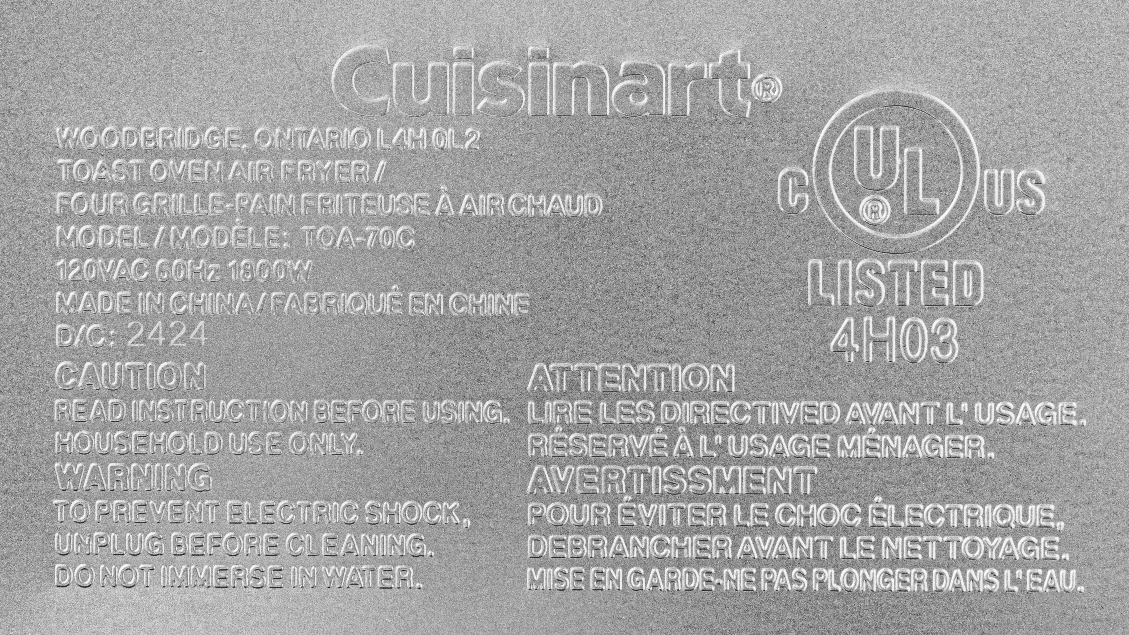 The Cuisinart TOA-70 comes in 'Stainless Steel,' 'Black Stainless Steel,' 'White,' and 'Navy Blue.' We tested it in 'Stainless Steel.' Here's a picture of our unit's label.