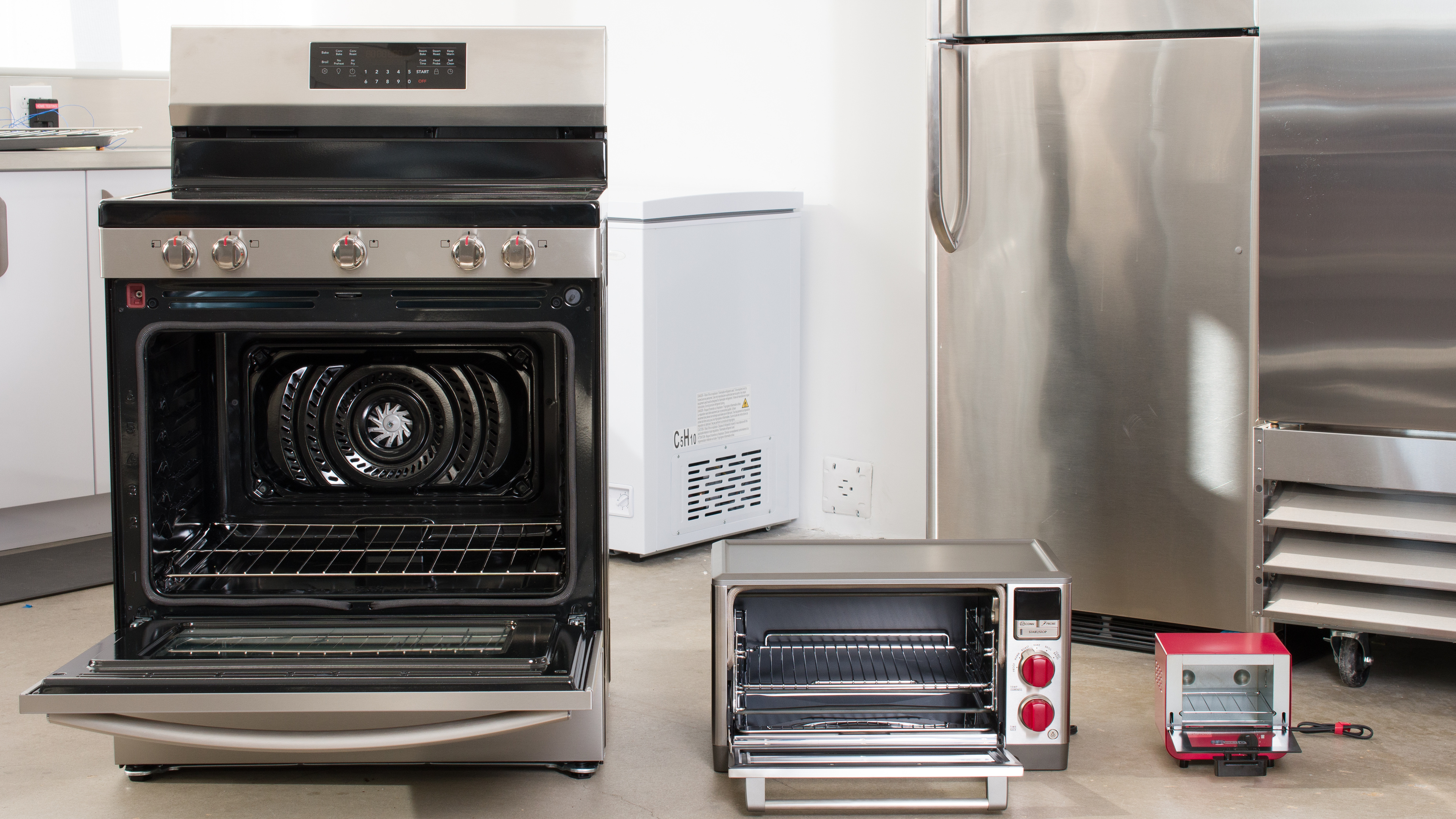 The Frigidaire Gallery GCRE306CBF is a mid-range 30" electric oven and range with five burners. While it's a full-size oven and not a toaster oven, it has some of the same features found on toaster ovens, including an air fry function and steam cooking. We tested this oven in conjunction with our R&D investigation into the differences in performance between toaster ovens and full-size ovens when it comes to common uses like baking, toasting, and air frying.