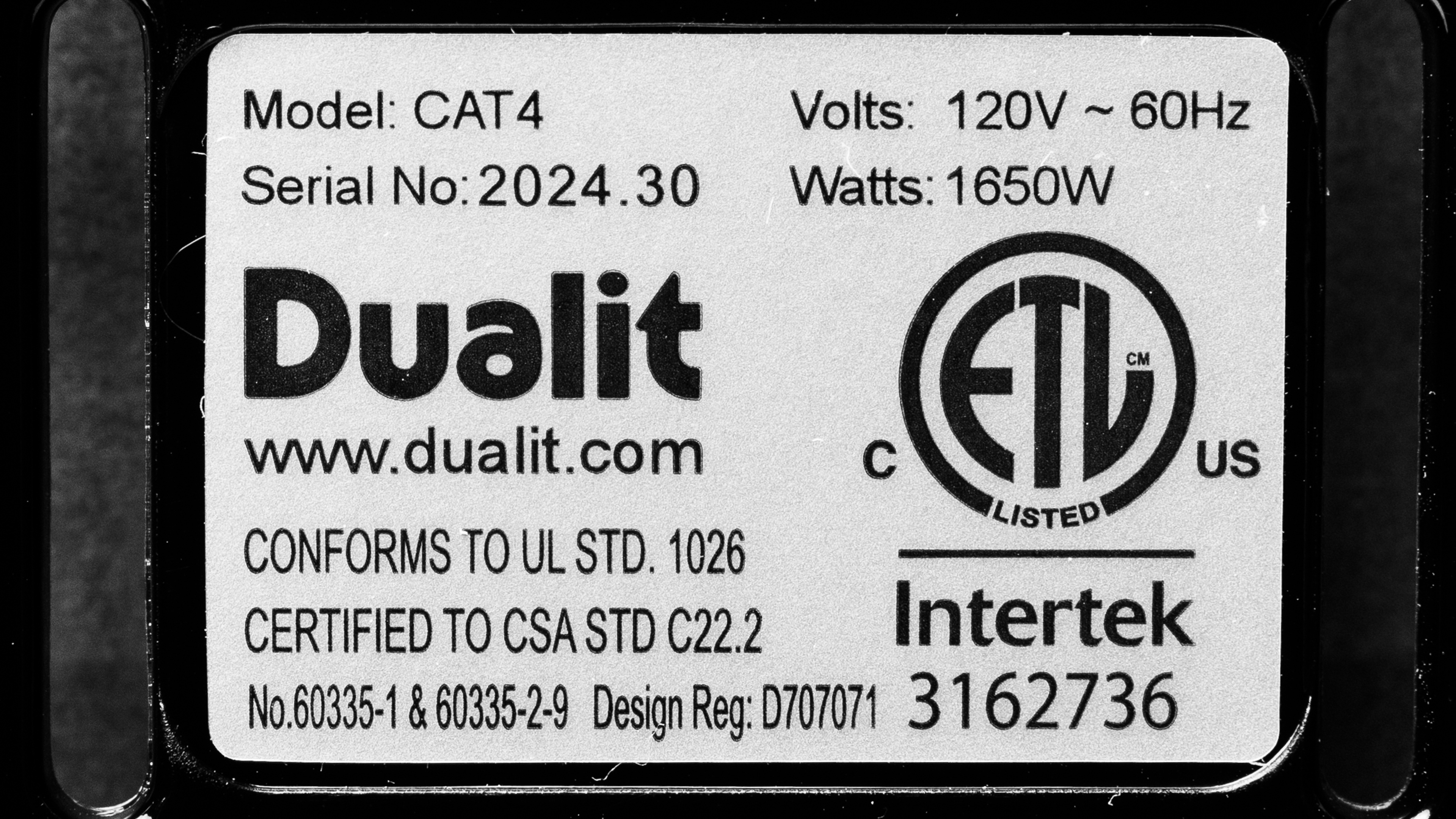 The Dualit Design Series 4 Slice, also called the Dualit Architect Series 4 Slice depending on where you purchase it, is available with a Black or Stainless Steel body. Both models come with stainless steel side panels, but you can buy panels from Dualit in various other colors if you want a different look. Here's our model's label.
