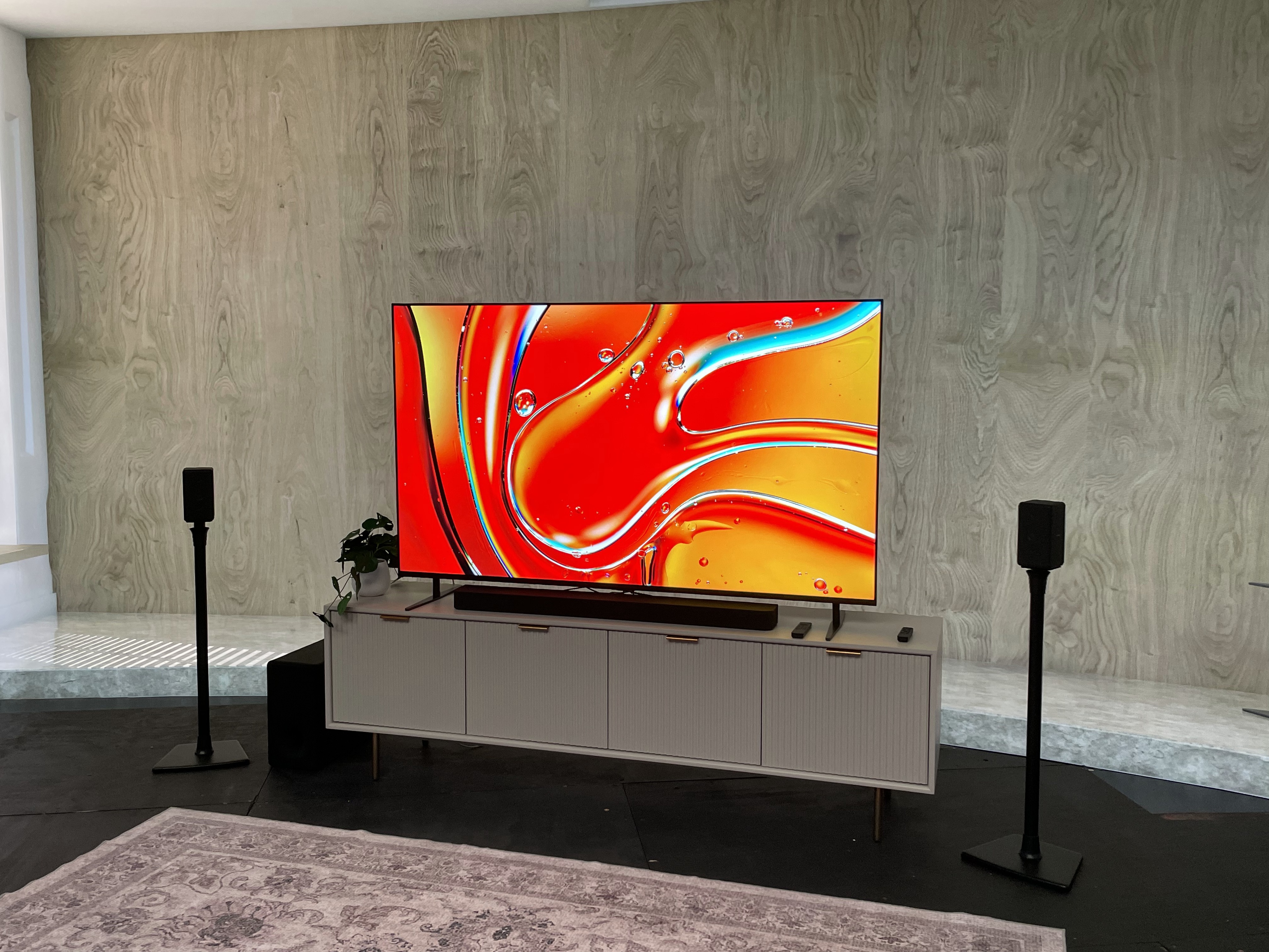 Other than the tech specs above, which are still largely unknown, we learned a bit about the overall design philosophy for Sony's 2024 lineup. All four new models share a similar design language, with very slim bezels on all models down to the entry-level Sony BRAVIA 3. New this year is a four-position stand on the BRAVIA 7, 8, and 9, so you can place the feet in a wide or narrow stance, high or low, to allow for a variety of table sizes and give you the option to set a soundbar in front of the TV without blocking the screen. There's also a new slim wall mount, the Sony SU-WL905, which now supports TVs up to 85" and comes with brackets for a soundbar, so when you swivel your TV out, the soundbar comes with it.