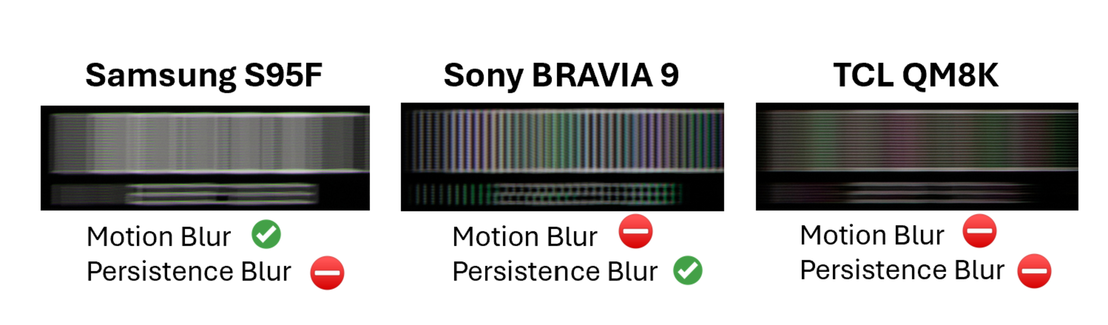 As you can see in the image below, the numbers on the Sony BRAVIA 9 are readable, since the TV has the least amount of persistence blur out of the three models. However, the BRAVIA 9 doesn't perform nearly as well when it comes to motion blur. On the other hand, the Samsung S95F is an OLED with almost no flicker at all, which leads to more apparent persistence blur, but the TV has the least amount of noticeable motion blur. The TCL QM8K doesn't perform well when it comes to motion blur and persistence blur.