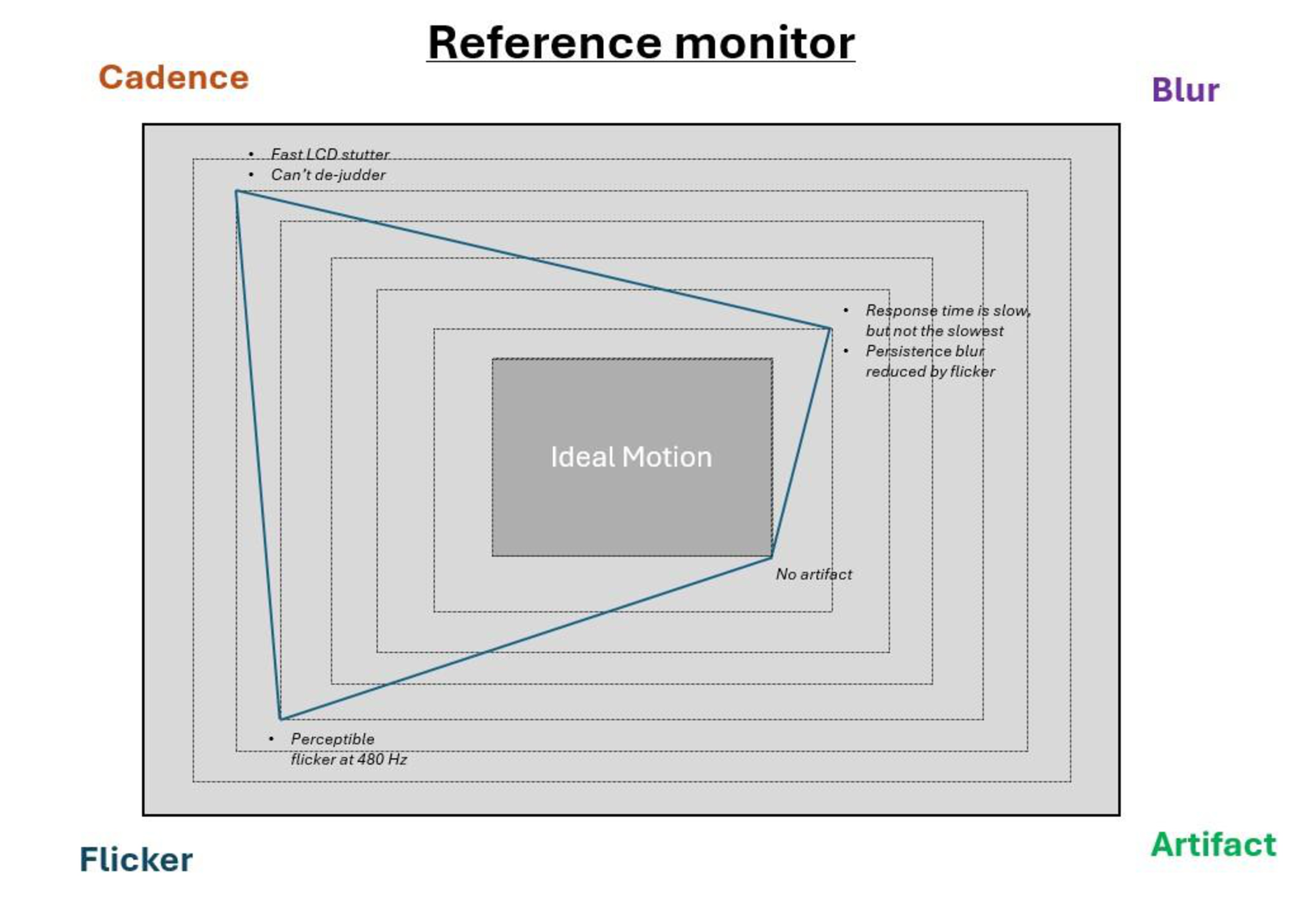 As we discovered more about motion handling during our research, we concluded that most of the different aspects that affect motion handling fall into one of four distinct categories: Cadence, Flicker, Blur, and Artifacts. We'll have more articles in the future that take a deep dive into what makes up these four pillars, but for now, let's take a quick look at each of these pillars to see exactly what goes into each one.