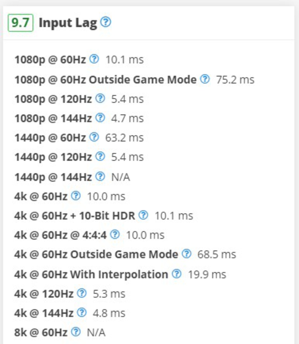 We also adjusted the 144Hz input lag measurements to instead measure the input at the maximum refresh rate a TV supports for both 1080p and 4k. With more and more TVs supporting 165Hz and even higher refresh rates, this ensures we're showing you the best input lag a given TV can provide.