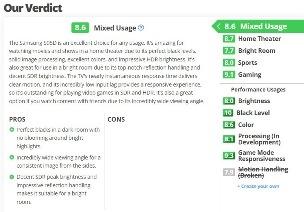 Our usage scores have also been completely revamped. We've removed a few outdated usages and simplified others. We've also added new Performance Usages to TV reviews. These usage scores look at specific aspects of a TV's performance, so if you care about Brightness, for example, you just have to look at the Brightness score to understand how well the TV performs in that aspect. We're also much harsher on some of our scoring, ensuring that the scores accurately represent how a TV really performs and making it easier to choose one TV over another.
