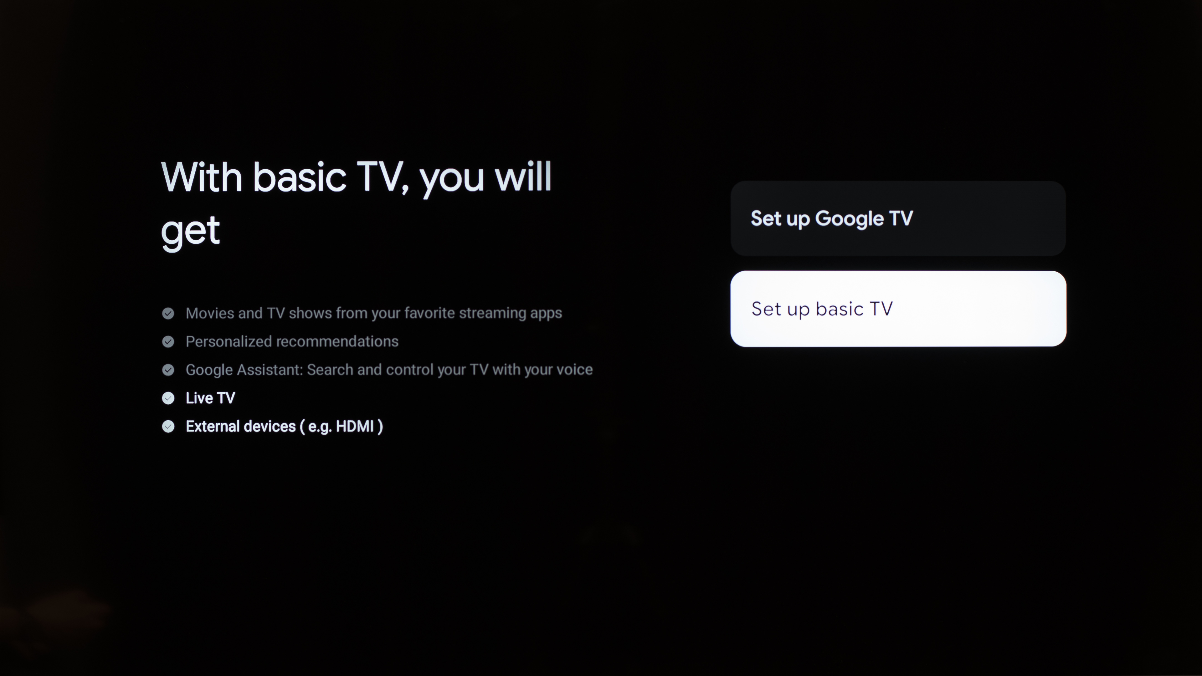 Google TV offers a 'Basic TV' setup option for users who want a simpler, more streamlined experience. In Basic TV, you can watch TV through your cable service, satellite, TV tuner, or antenna using the TV app, play media from other inputs plugged into the TV, and use a limited set of apps that come pre-installed on your device. However, you can't sign in to a Google Account, access your Play Library, install new apps, use the Assistant to search for content, or cast from another device. Basic TV is designed for households or users who prefer a straightforward experience without the extra smart features.