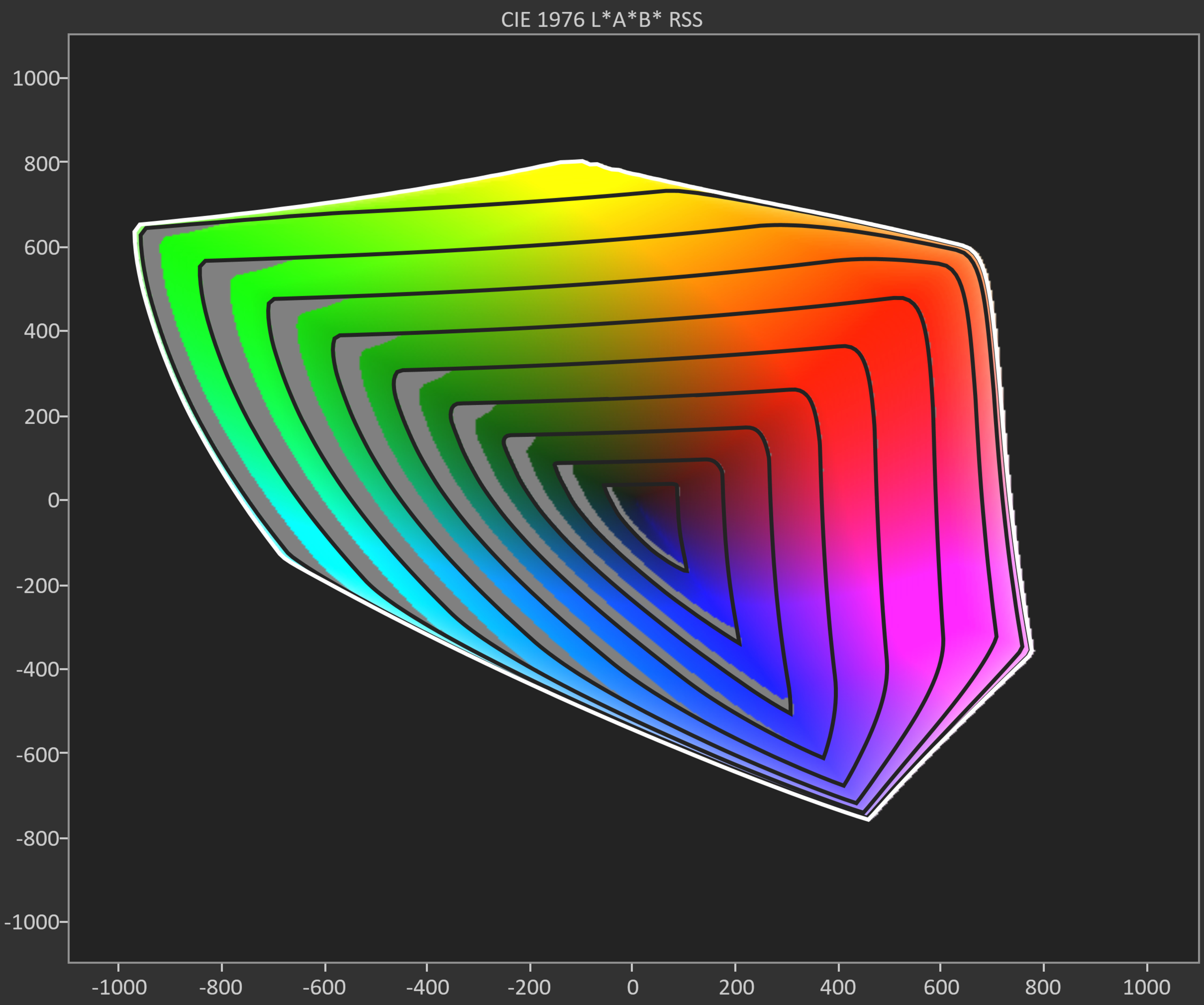 There are many different ways to evaluate a TV's ability to produce colors. Our SDR color volume approach looks at the range of colors that a TV can display, breaking it down into easy-to-understand slices. This test focuses on SDR, which is what you'll find on most DVDs, Blu-rays, and cable TV channels. Each slice shows a different range of lightness, so you can see how well the TV performs in both bright and dark scenes. The gray areas on each slice show areas where the TV can't produce colors that are as saturated as they should be.