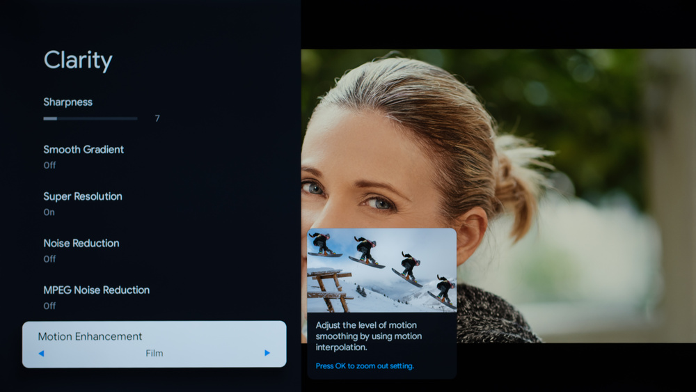 For our 480p upscaling test, we set Sharpness to '7,' with Super Resolution set to 'On.' Sharpness processing was calibrated with no over-sharpening for low-resolution content.