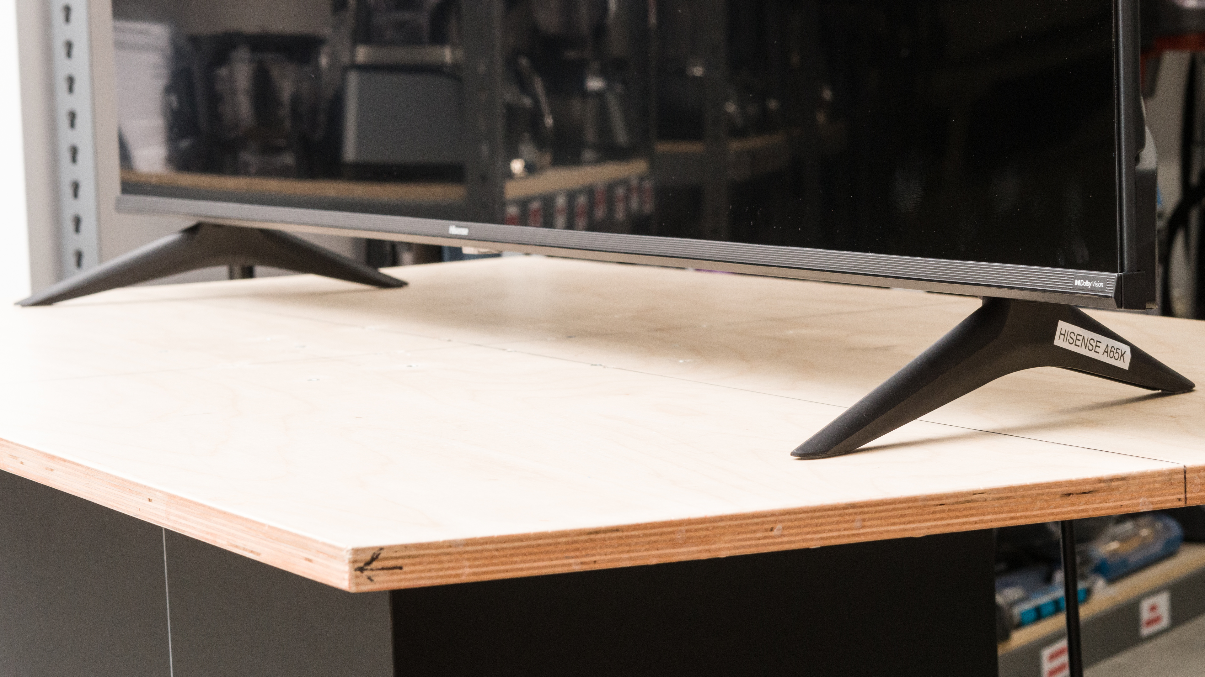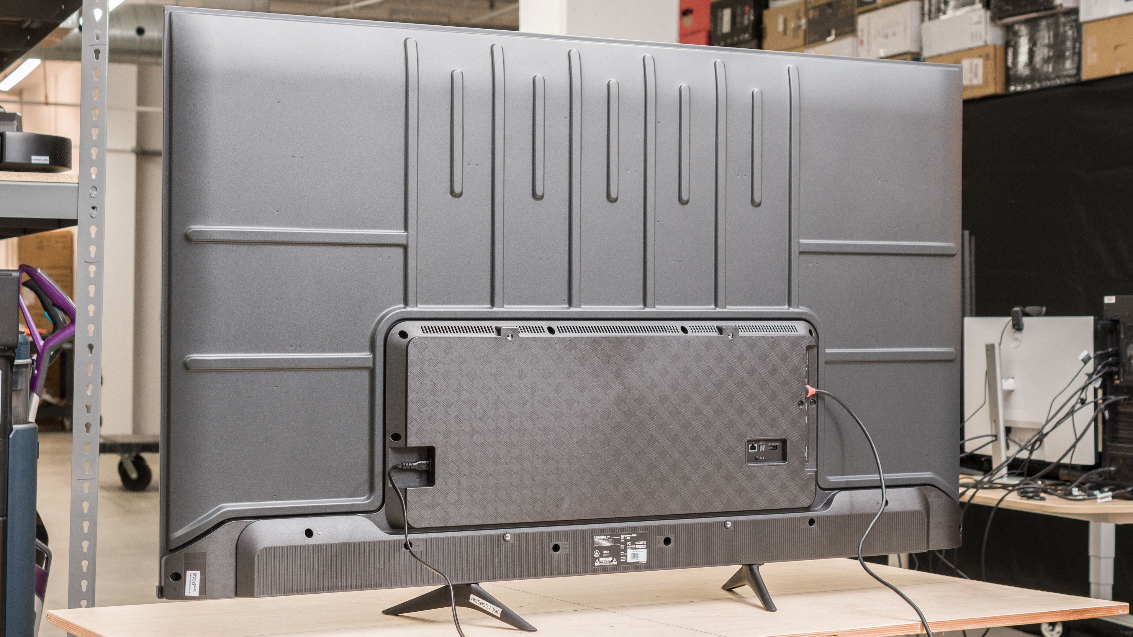 We tested the 65-inch Hisense A65K, and our results are also valid for the 43-inch, 50-inch, 55-inch, and 75-inch models. The 43-, 50, and 55-inch sizes only have three HDMI inputs, but they have a full-sized composite input with dedicated audio and video ports. The 65- and 75-inch sizes have four HDMI ports, but they require an adapter for composite inputs, which is sold separately. There's also a difference in the stands, as the three small sizes only support a wide position for the two feet, whereas the larger sizes also offer a narrow position.