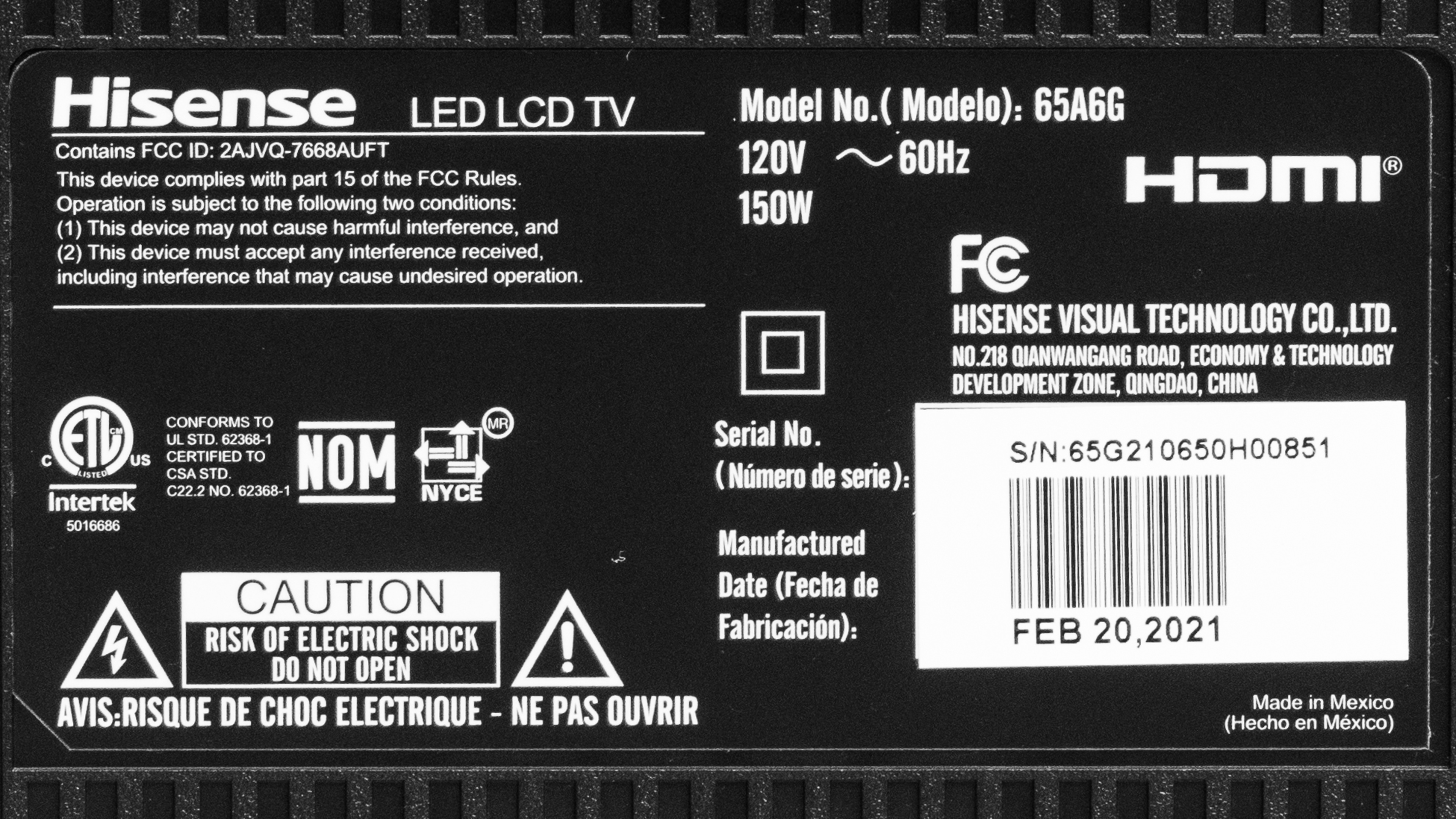 The unit of the Hisense A6G we reviewed was manufactured in February 2021, and you can see the label here.