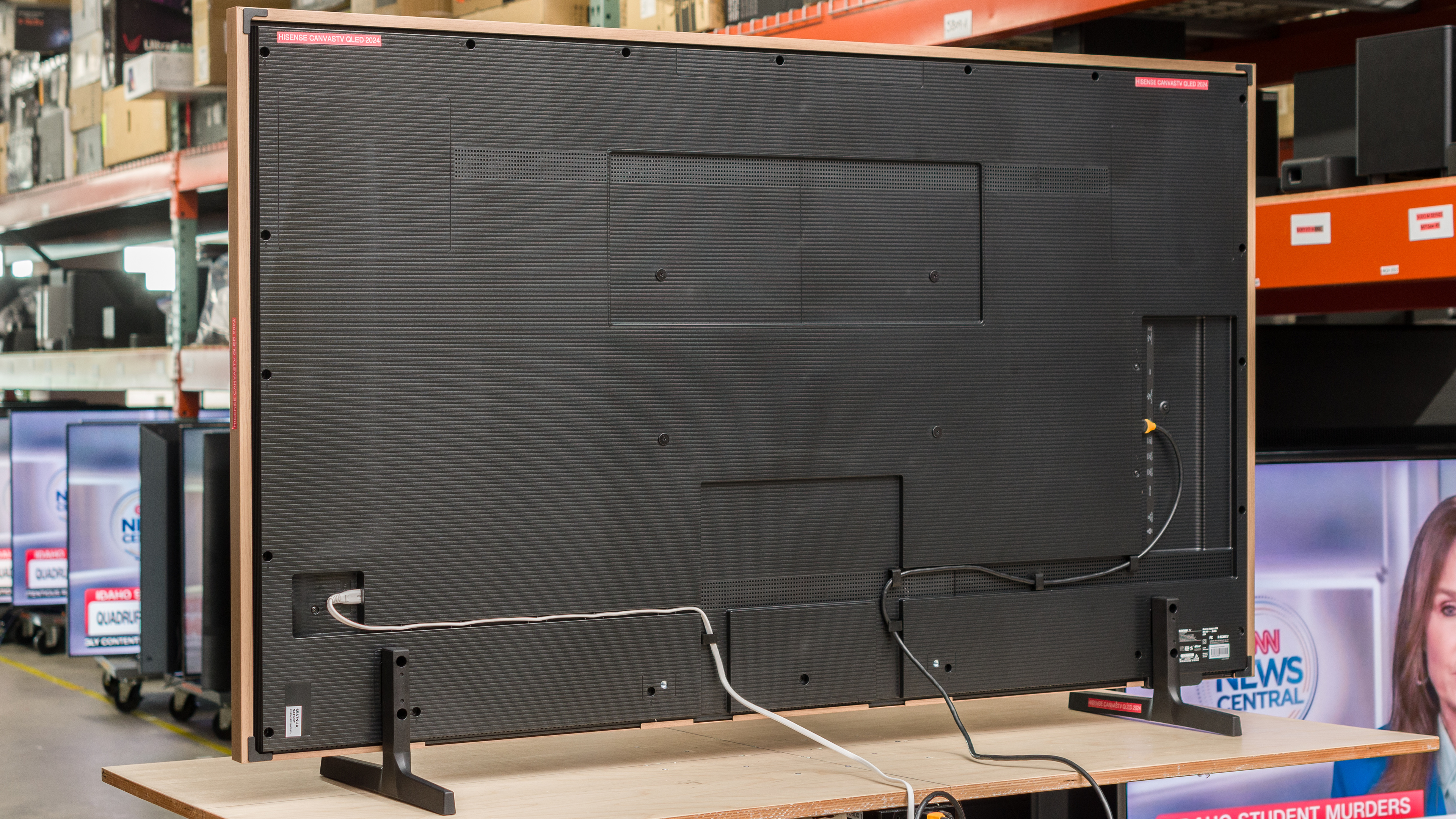 The back of the TV is plain and made entirely of plastic. Most of the inputs are side-facing and aren't too hard to access when the model is mounted flush against the wall. The TV has clips on its back to help with cable management, although the cables then dangle directly from the back as there isn't any way to hide them.