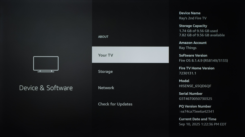 This TV has about 7.82GB of accessible internal storage with the included apps installed. These settings are valid for the unit we bought and tested, and it was calibrated on Fire OS 8.1.4.9 (RS8149/3133).