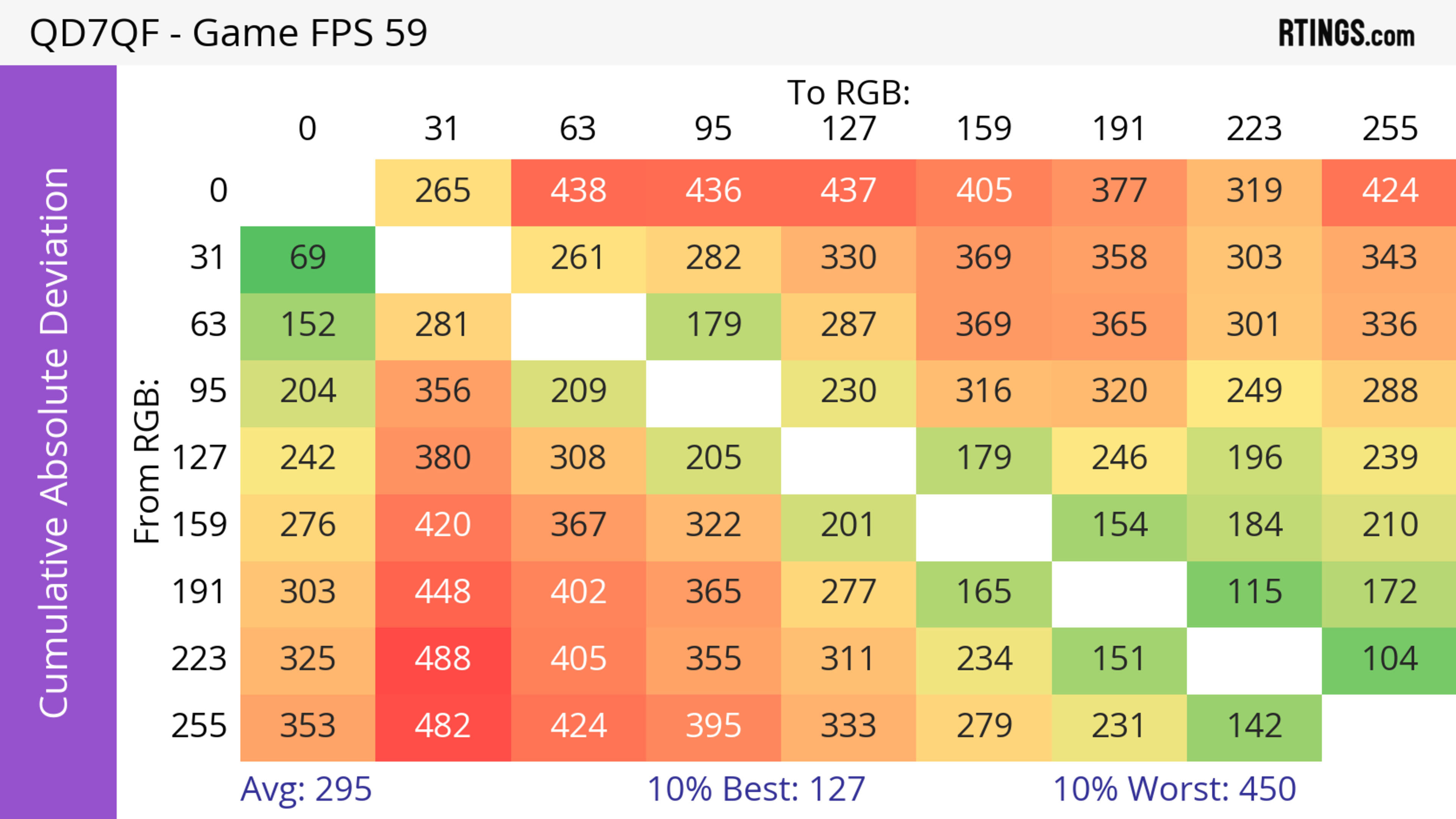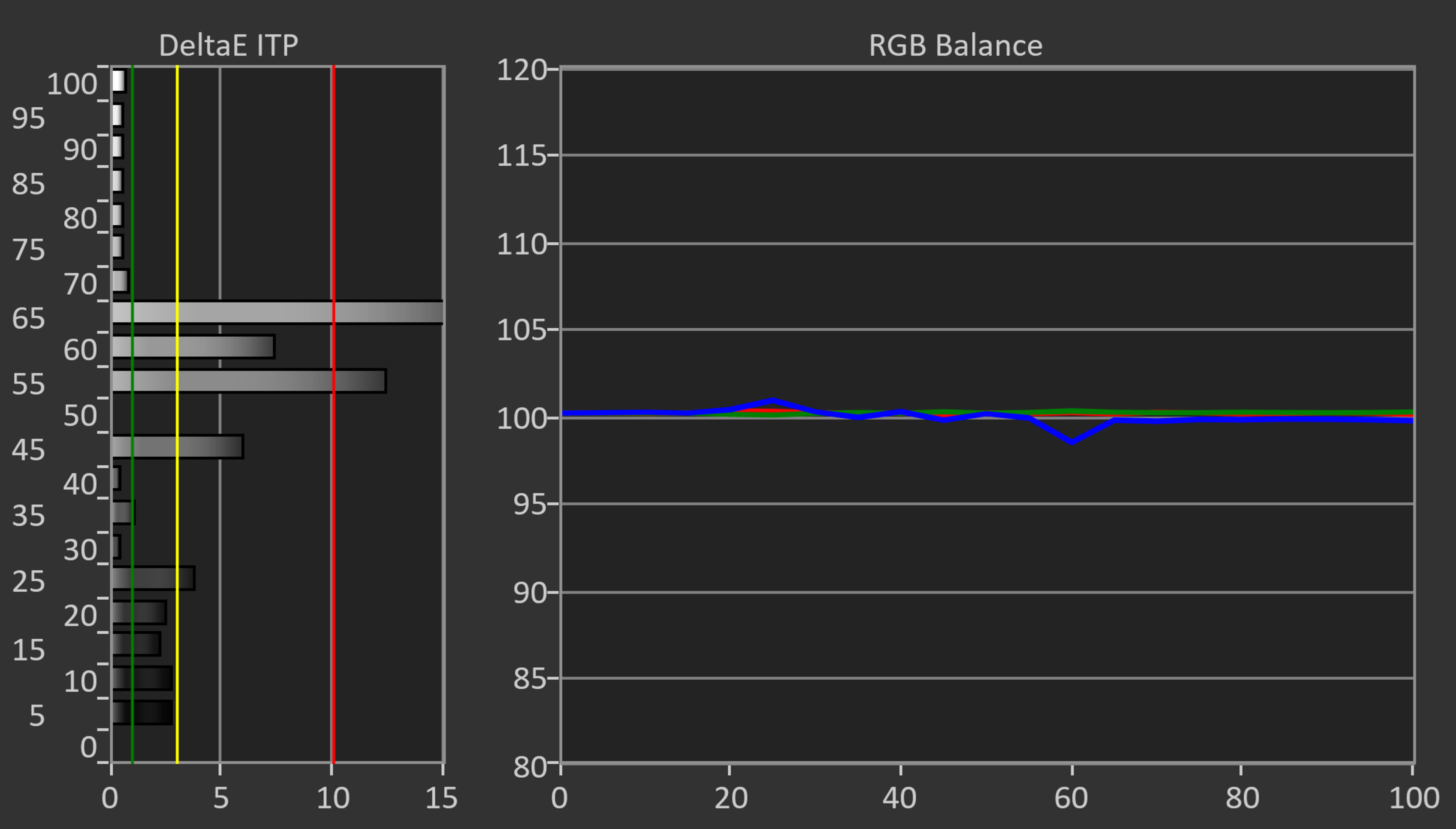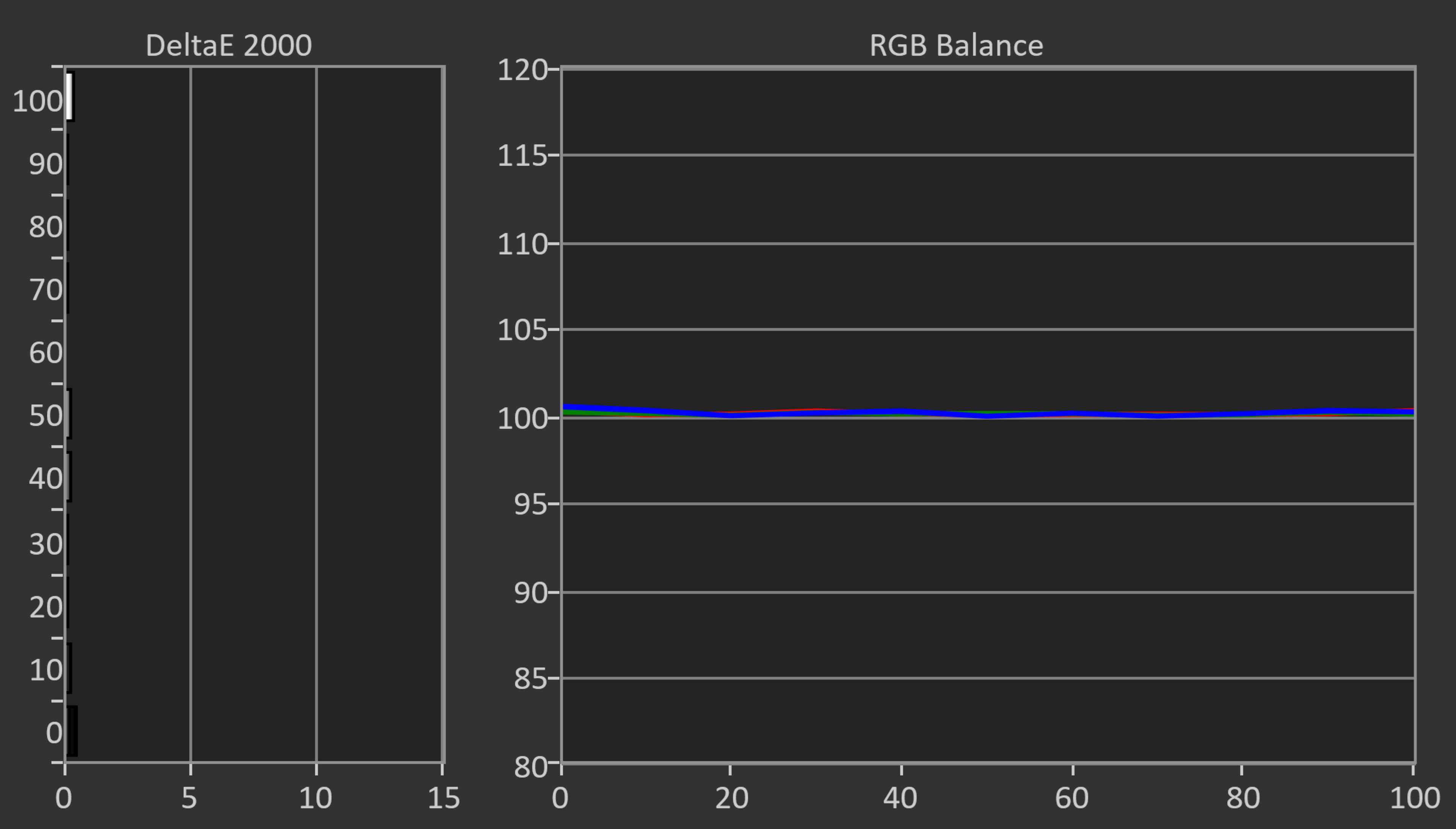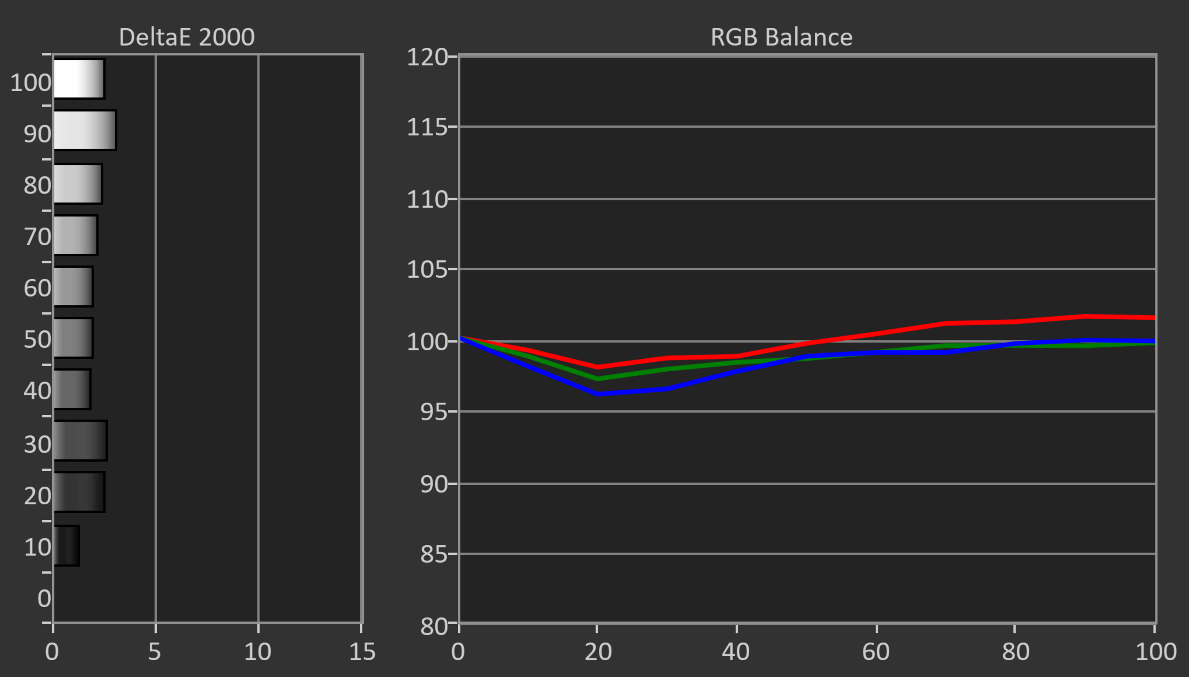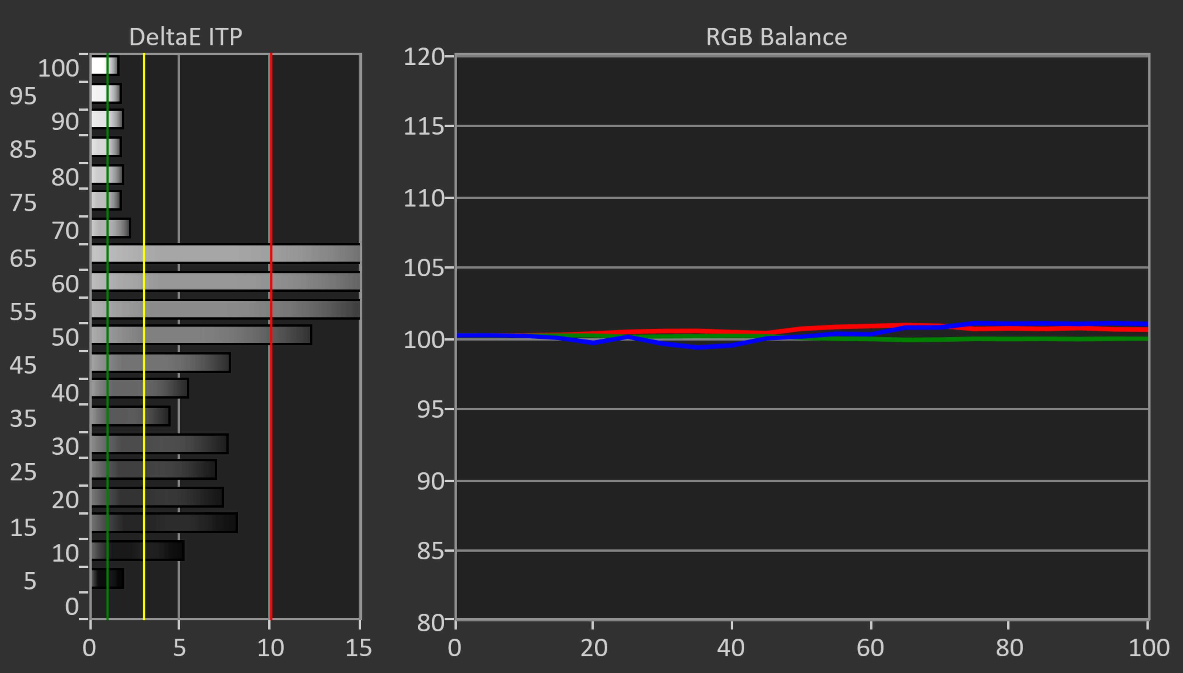 The Hisense QD7QF has great accuracy in HDR out of the box. The white balance is great, with just a few issues in midtones, and color accuracy is good overall. The RGB balance is very good as well, and the overall color temperature is just a bit warm.