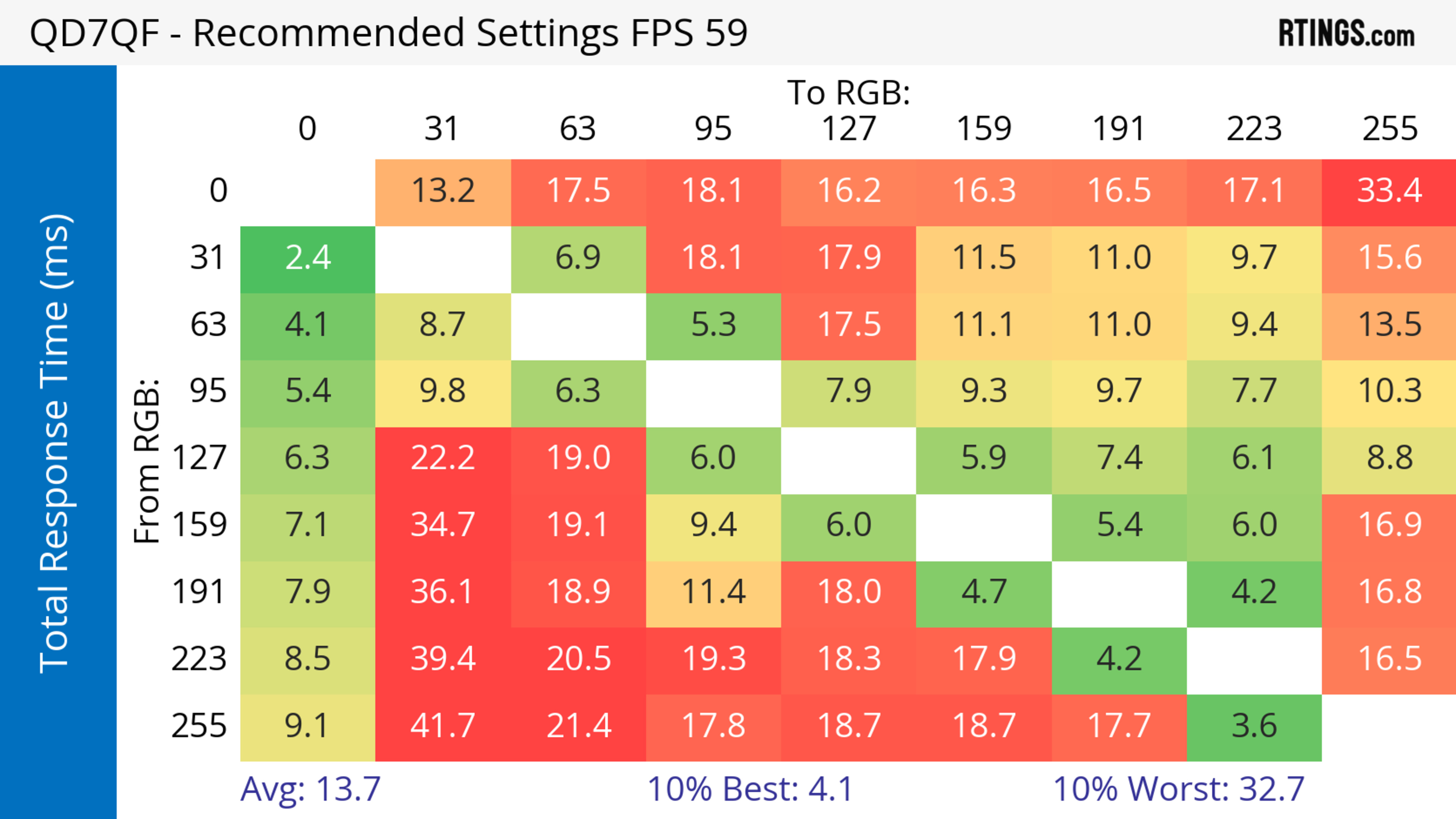 The Hisense QD7QF has just okay responsiveness when you switch to Game Mode. It has low input lag, ensuring a responsive gaming experience in some supported modes. It has limited format support, though, as it can only do 4k @ 60Hz or 1440p @ 120Hz, with no support for the far more common 1080p @ 120Hz. This also means that it doesn't work with Low Framerate Compensation when gaming at 4k, so you'll still see tearing. Finally, pixels are slow to transition between shades, resulting in a blurry experience overall.