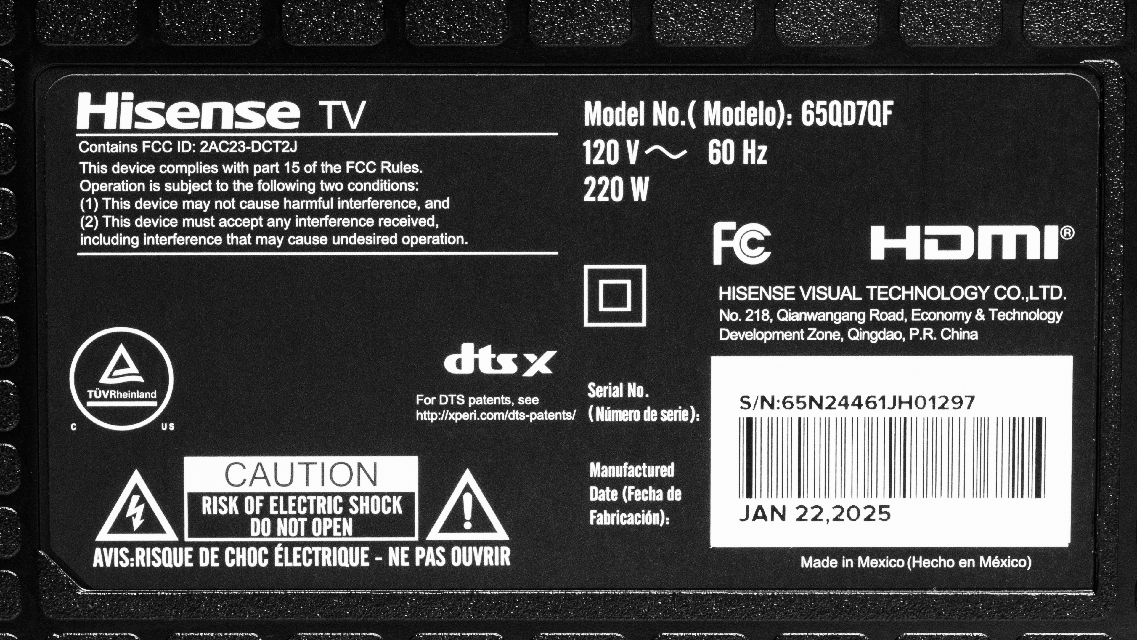 We bought and tested the 65-inch Hisense QD7QF, and these results are also valid for the 50-inch and 55-inch models. The 75, 85, and 100-inch models are advertised with completely different specs, including a higher refresh rate, HDMI 2.1 bandwidth, and more dimming zones, so most of these results aren't valid for those sizes. In Canada, this TV is known as the Hisense QD7QFM, but it's the same TV.