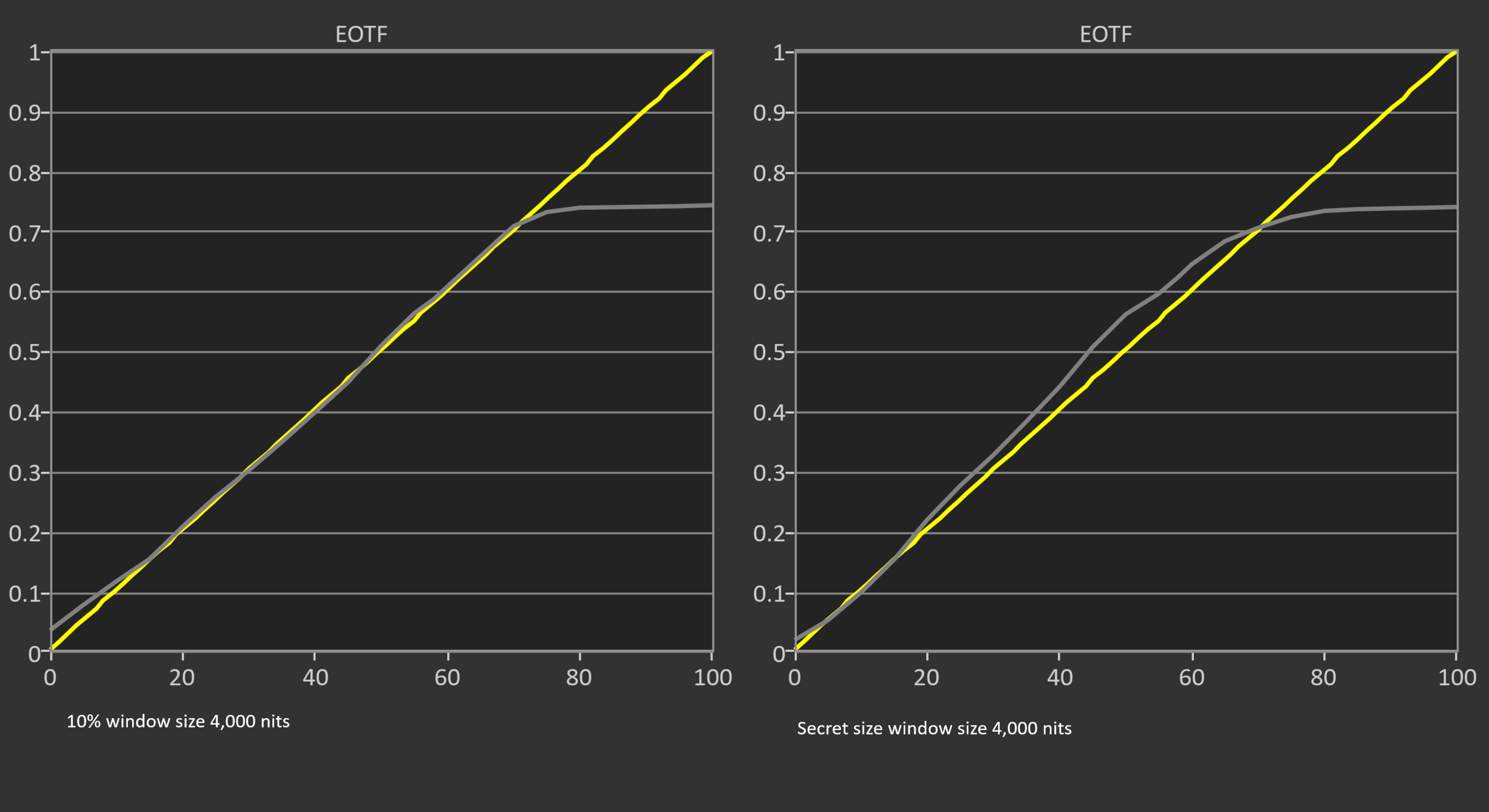 The Hisense U65QF has poor PQ EOTF tracking. Almost everything is displayed drastically brighter than intended, so this isn't a TV that stays true to the content creator's intent in HDR. The TV tracks the PQ EOTF curve much closer with a standardized 10% window, but this isn't indicative of real-world usage, since highlights in HDR content don't take up exactly 10% of the screen. There's a gradual roll-off near the TV's peak brightness when displaying 4000 nit content to help maintain details in specular highlights.