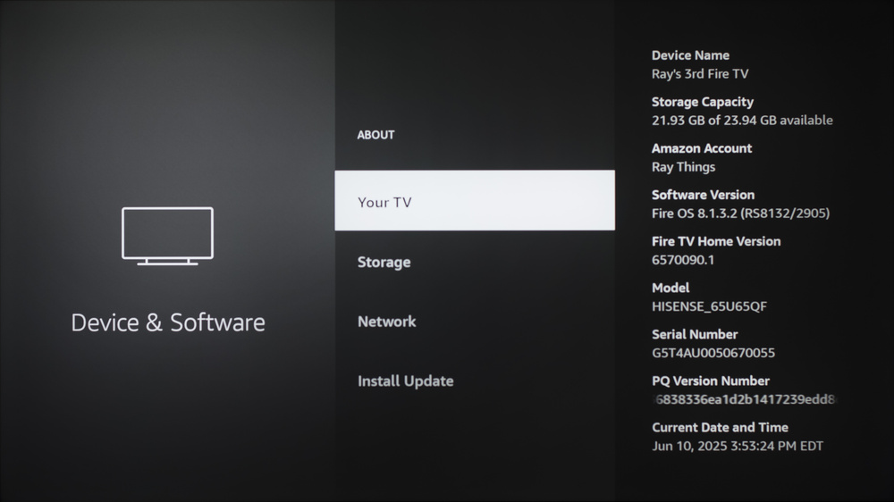 This TV has about 21.93GB of accessible internal storage with the included apps installed. These settings are valid for the unit we bought and tested, and it was calibrated on Fire OS 8.1.3.2 (RS8132/2905).