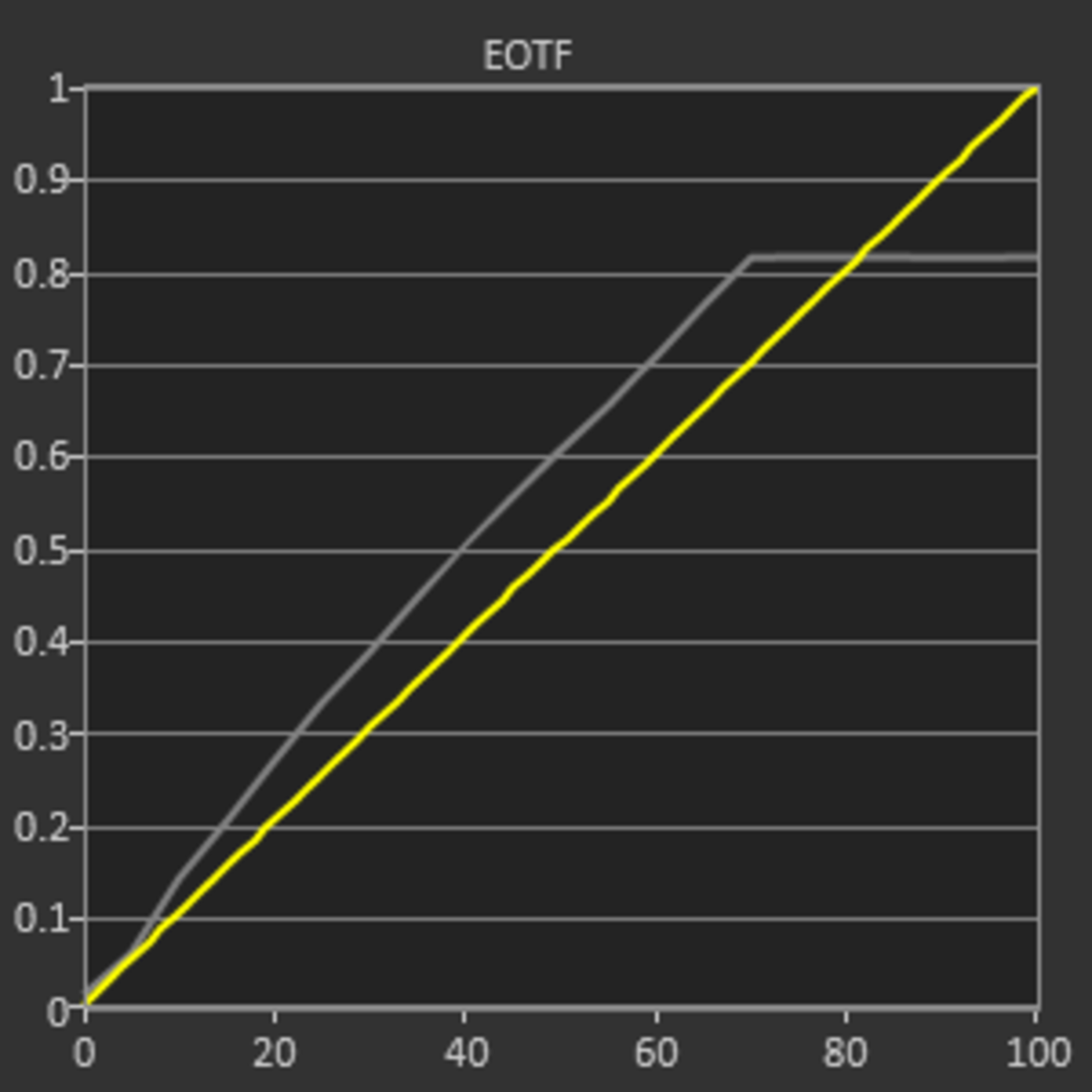 The TV tracks the target PQ EOTF extremely well in the 'HDR Theater' Picture Mode with local dimming set to 'High'. There's a slow roll-off as the brightness approaches the TV's peak brightness, so fine details in bright scenes are preserved well. The EOTF in 'FILMMAKER' mode looks nearly the same as the 'HDR Theater' Picture Mode, but that mode locks you out of most settings. Setting Local Dimming to 'Low' results in a less accurate EOTF overall. When FreeSync is active, the TV hard clips when it reaches its peak brightness, as you can see here, leading to a loss of bright detail.
