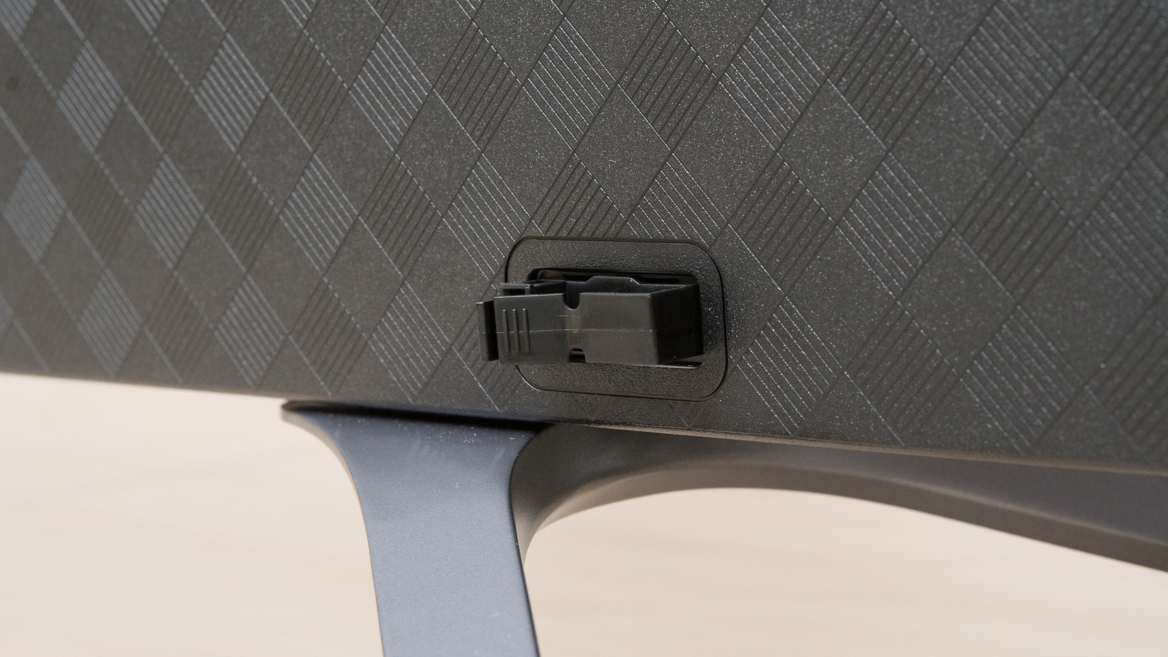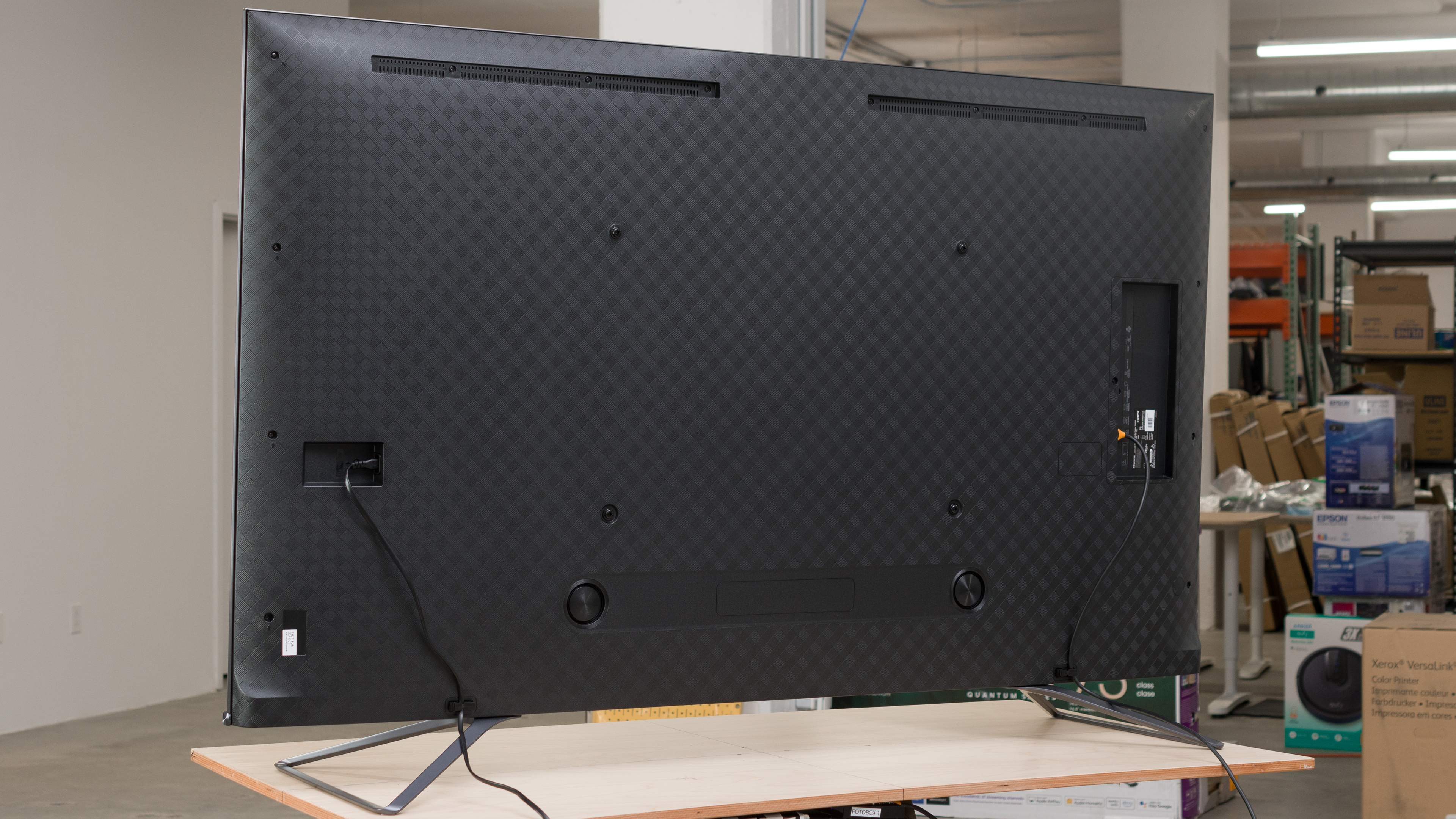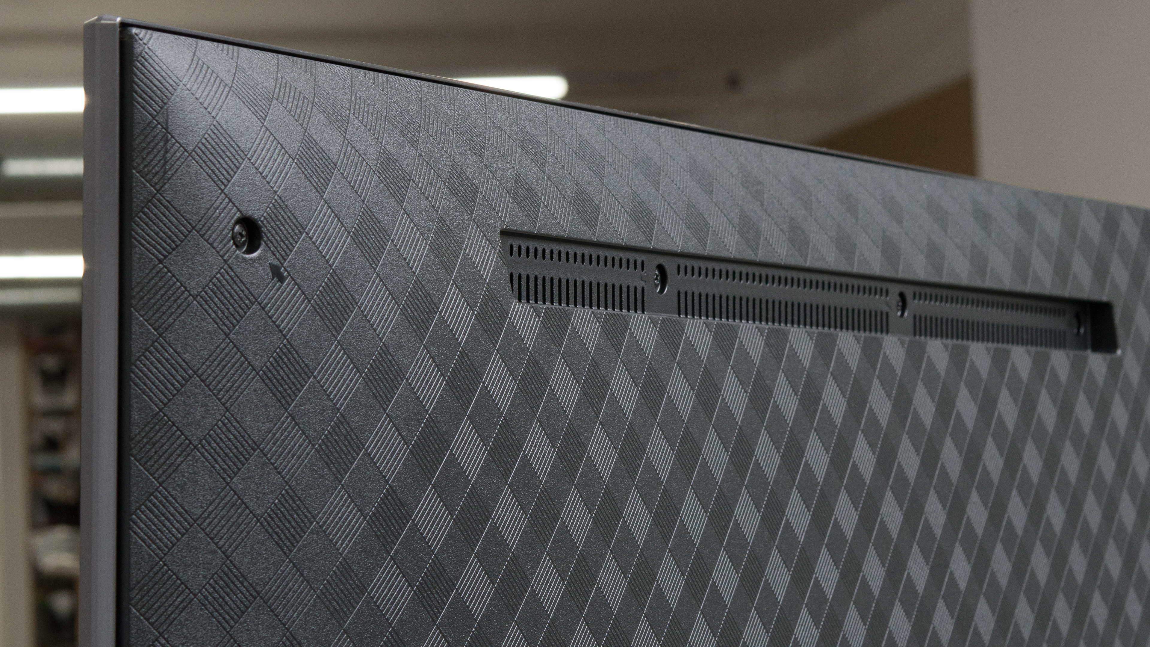 The back of the Hisense U800GR has a textured back panel, and there speakers at the bottom and vents at the top. It also has two clips for cable management to keep your setup tidy.
