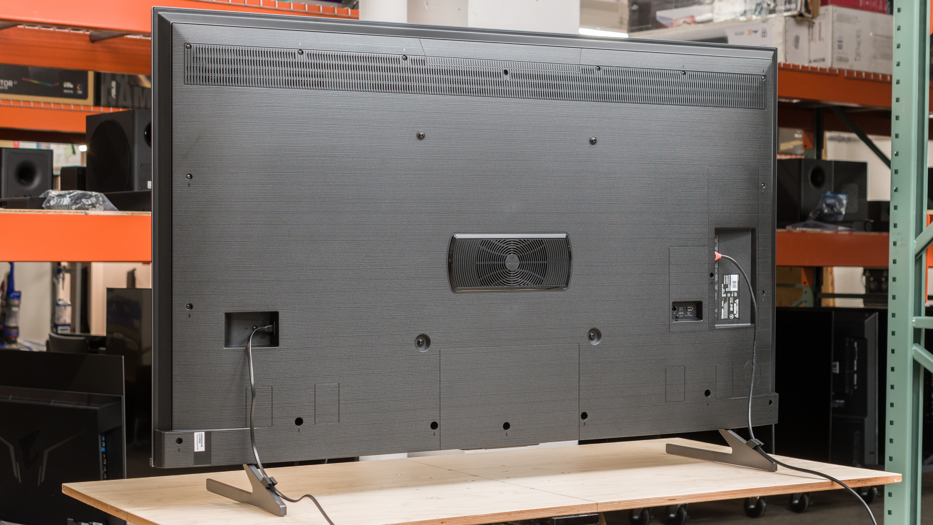 The back of the TV is made of plastic, with a textured horizontal pattern and vents along the top. There's also a built-in subwoofer on the back of the TV near the center. There are clips built-in to the feet to help with cable management. The inputs are on the left-hand side of the TV when facing the front, and they're easy to access even when the TV is wall-mounted.