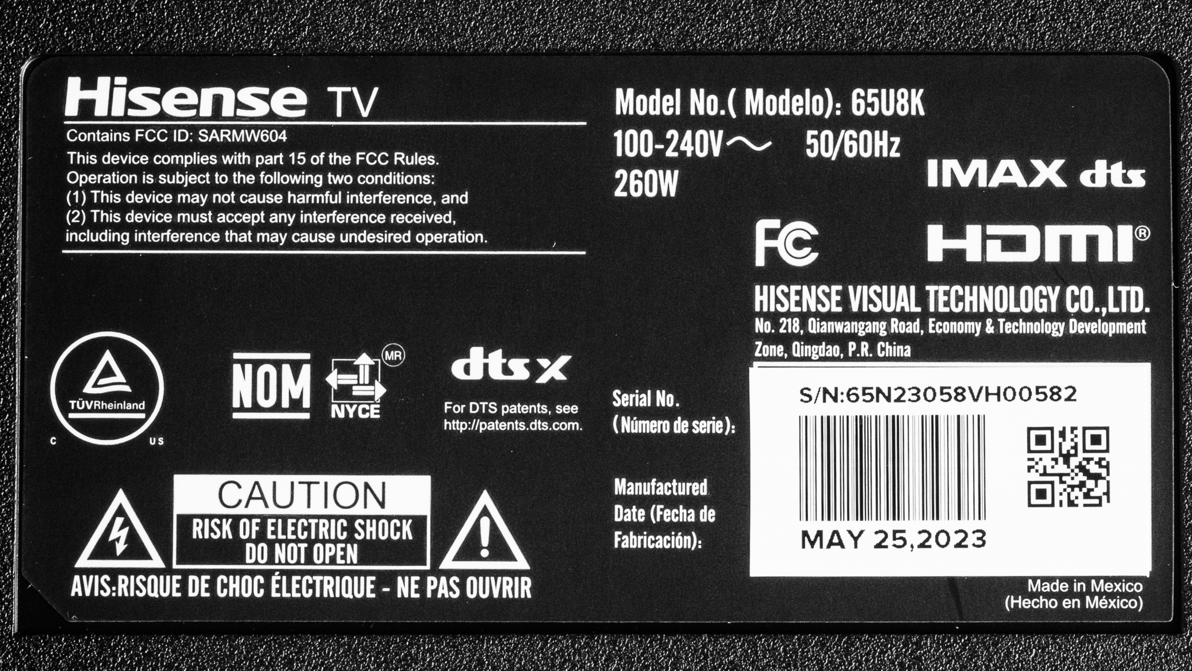 We tested the 65-inch Hisense U8K, and the results are also valid for the 55, 85, and 100-inch models. The 75-inch model uses an ADS Pro panel, so it performs a bit differently than the other sizes, as it has worse contrast and black uniformity, different reflection handling due to its glossy screen coating, and a wider viewing angle. In Canada, it's known as the Hisense U88KM, and it performs the same. There are similarly named international models, like the U8KAU in Australia, but these models perform differently to the North American U8K, so our results aren't valid for those models.