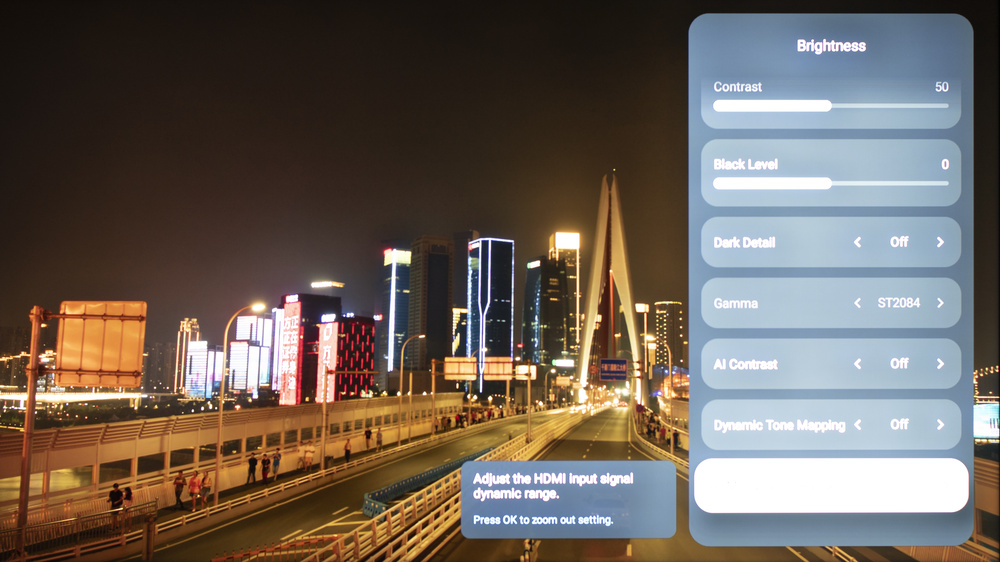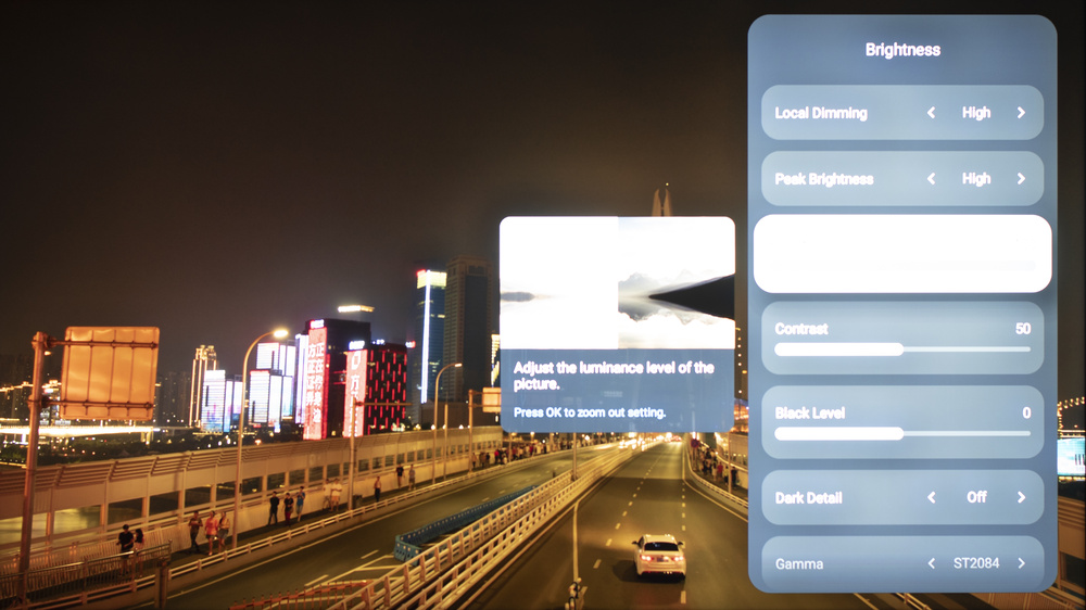 For SDR content, you can choose a few different preset picture modes. We used the 'Theater Night' Picture Mode because it's the most accurate out of the box and allows for the most customization. A Brightness setting of '32' corresponds to about 200 nits on our unit, which is our target for a moderately lit room, but you should adjust this setting to your specific viewing condition. For our peak brightness test, brightness was set to maximum with 'Peak Brightness' on 'High'. Below are the settings we used for SDR. All other settings were either disabled or left off. If you're in a dark room, the BT.1886 gamma setting is a good choice, as that's the setting most commonly used during the mastering process.
