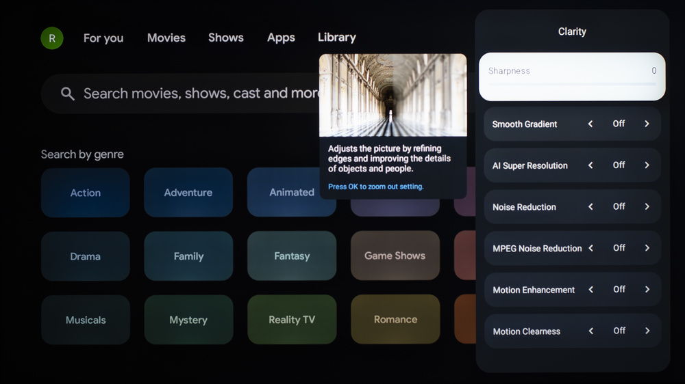 For our 480p upscaling test, we set Sharpness to '13,' with Super Resolution set to 'On.' Sharpness processing was calibrated with no over-sharpening for low-resolution content.