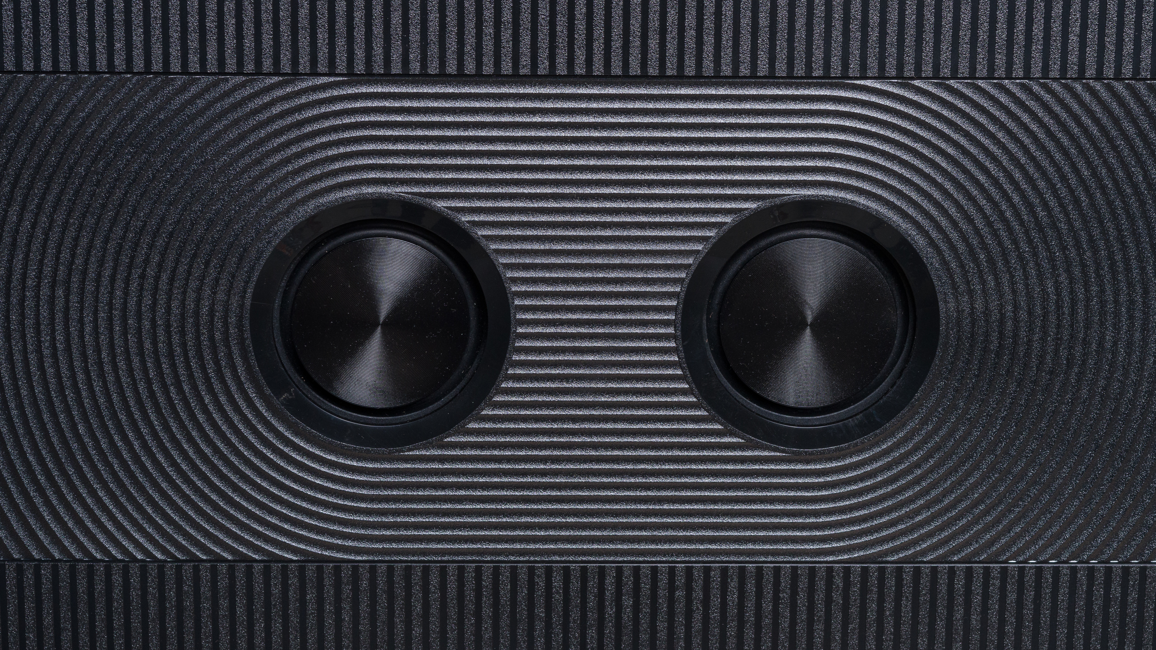 The TV's back is made of plastic, with two different textured patterns: vertical lines in its center plate and horizontal lines on the side panels. Near the center, there's a built-in subwoofer. The TV has clips for cable management on its feet, through which cables can be funneled.
